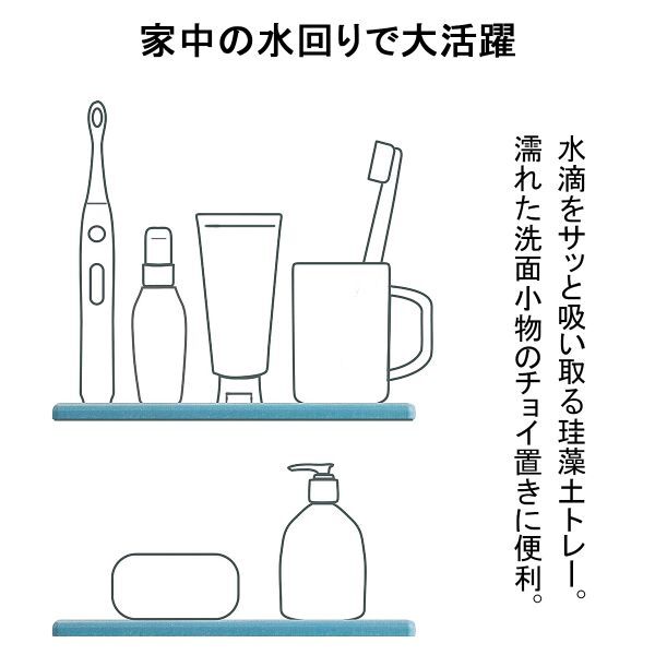珪藻土(けいそうど)とは細かい穴が無数にある多孔質構造の土のことです。その無数の小さな穴の効 果で水滴をサッと吸い取り、自然乾燥できます。自然素材「珪藻土」で作ったトレーはディスペンサートレーにぴったりの吸水力と乾燥性が実現されています。 ▲乾燥・防カビ・吸湿・脱臭 多孔質構造で吸収した水分が、一定的な量に達すると、自立呼吸によって放出します。表面は いつもサラサラで、バイキンやカビ・ダニの繁殖防止・脱臭効果の役割も果たしてくれま す。 ▲コンパクトサイズ・用途が広い 細長い形で水回りオールラウンドで使える絶妙なコンパクトサイズです。食器やグラスな ど“ちょっと洗い”したものはもちろん、洗面所の歯磨き粉、ハンドソープ、観葉植物なども置くことをおすすめです。 ▲活躍場所・プレゼント 洗面台やキッチン等、水が飛び散りやすい場所にお使いいただくことで、水まわりをきれいに保ちま す。シンプルなデザインと色合いでどこに置いてもスッと馴染みますので、引っ越し祝い、誕生日祝い、結婚祝い、会社の記念 品などのプレゼントとしてもよろしいです。 ※ご購入後、取引ナビにて色をお知らせください。 |