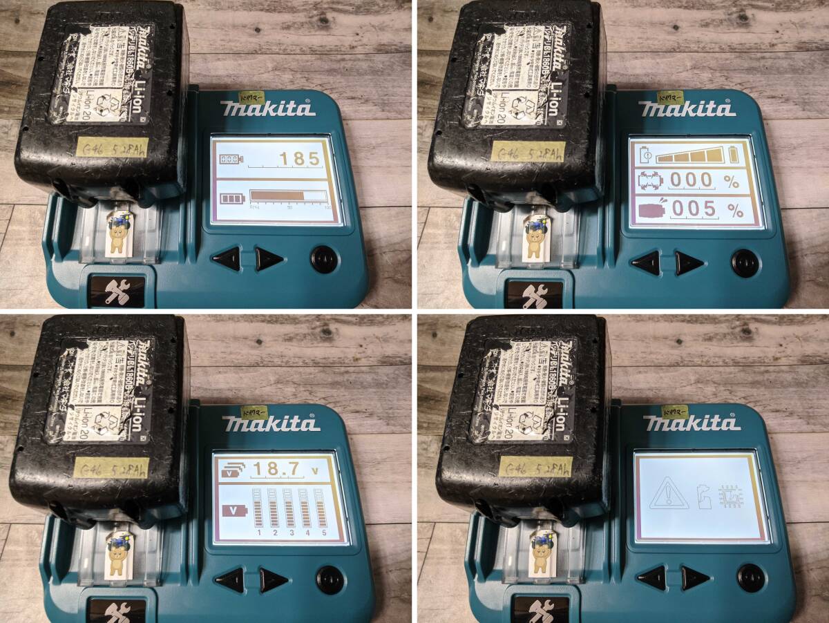 ・ 温度センサーと断線しやすい電圧検出ラインの故障予防処理(修理の有無に関わらず実施) ・ 外装内装、基板、スライドロック、スプリング、ネジの清掃及び洗浄、場合により塗料除去や鉄粉鉄片取りなど含む ・ ヒューズ交換と電圧検出ラインの再接続(e49) ・ バッテリーセルバランス調整(各セルの電圧差は±0.01V程度まで) ・ バッテリーの実容量計測(最大電圧21Vから14Vまでの放電容量を計測) G46番:消費した電力95.2Whを定格18Vで割ると実容量5.28Ah(画像8) e49番:消費した電力91.3Whを定格18Vで割ると実容量5.07Ah(画像8) ・ マキタ純正充電器での充電電流確認 & 満充電時のバッテリー残量表示4点灯確認 DC18RF:G46番最大10.5A、e49番最大9.5A DC18RC:最大9A DC18RB:最大9A ※ 充電電流値はバッテリー温度などの条件によって変わりますので、上記は当方で確認できた参考数値です。 ・ マキタ製インパクトドライバーと、社外品インパクトレンチでの動作確認 ・ プラスチック用保護&ツヤ出し剤にて拭き上げ |