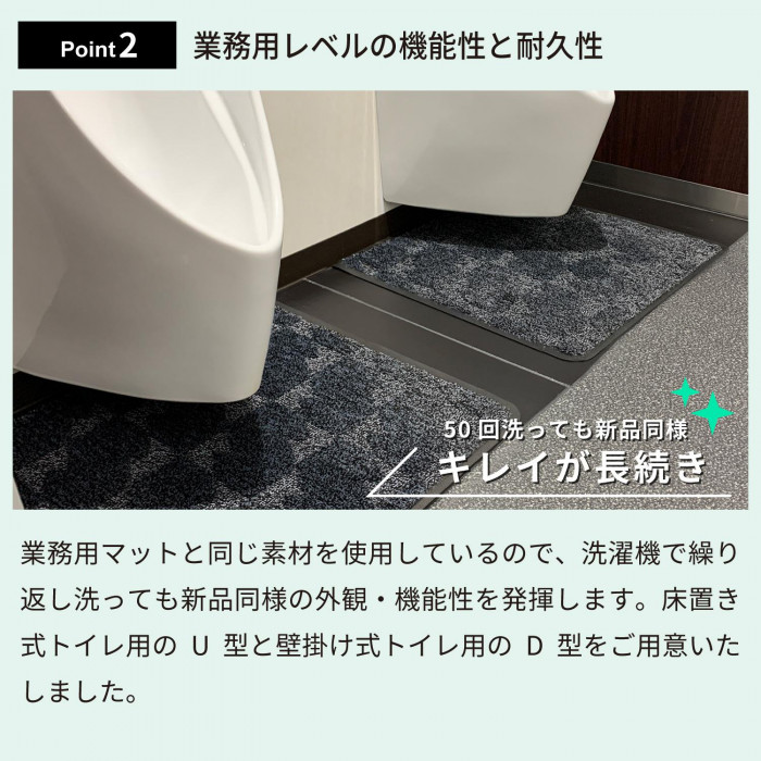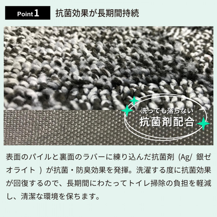 | 吸水・除塵性能に、バクテリアコントロール機能をプラスしたトイレマット。表面のパイルには抗菌糸を配合、裏面のラバーにも抗菌剤を練り込んでいます。洗濯する度に抗菌効果が復活。長期間にわたって衛生的にご使用頂 けます。 ※商品サイズは製法上、若干の誤差が発生します。 ※写真の色合いと実際の商品の色味は異って見える場合がございますので、予めご了承ください。 |