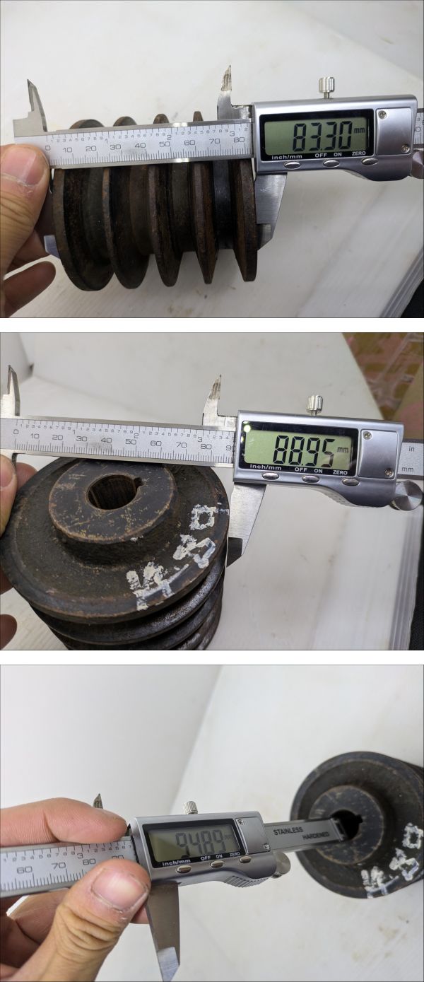 | ●●最後まで読んで下さい●●納得した上でご入札してください●● ●大型機械用のアカウントは**こ ち ら**です。 ●当方の別出品物を同時購入しても送料分安くなりません。 ●発送料金は入札ボタン付近にあり、沖縄、北海道、離島以外一律です。 ●塩尻市から発送します。 ●離島発送はできない場所がございますので、事前にお問い合わせください。 ●発送日は月、水、金、日です。急ぎの場合はご連絡をお願いします。 ------------------------------------------------------------------------------------------- ●4連のプーリーです。 ●Bベルトです。 ●軸 径:約Φ18mm ●鍵 幅:約5mm ●プーリー外径:約Φ89mm ●全体 厚さ:約95mm ●ベルト部 厚さ:約83mm ●書いたインクは消さずに発送します。 ●素人寸法のため、測定誤差があります。 ●中古品のため、サビや汚れがあります。 ●錆は各自で取り除いてください。 ●現状写真の通りのまま送ります。 ------------------------------------------------------------------------------------------- ●下の方にも画像がございます。※たまに写真の枚数が不足していて画像がない場合があります。 ●落札後、ご指定配達の時間帯がある場合はあらかじめご連絡してください。 | |||