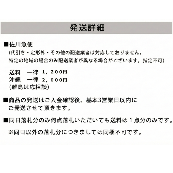 4、本站为日拍、代拍平台,商品的品质和卖家的信誉需要您自己判断。请谨慎出价,竞价成功后订单将不能取消。
