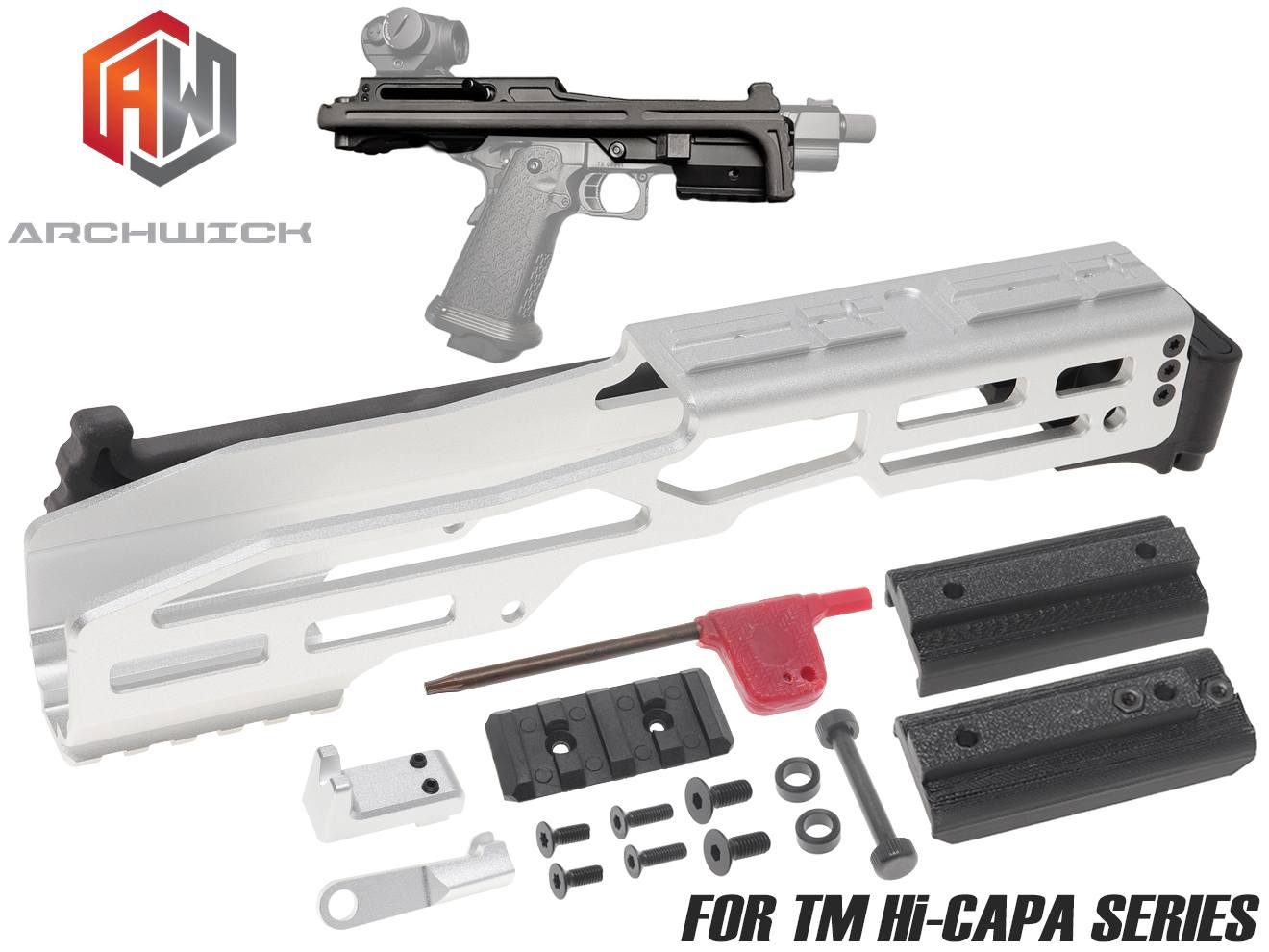 商品説明 ITEM INFO SMGより取り回しに優れたピストルカービン変換キット ARCHWICK PCC ピストルキャリバーカービン / CNCバージョン Gen.2 For Hi-CAPA です。東京マルイ GBB Hi-CAPA5.1/4.3に対応します。 GLOCK用USWカービンキットから着想を得て、ARCH WICKが独自に開発したハイキャパ用ピストルカービンキット。多くのGBB SMGよりも遥かに軽量で取り回しに優れた究極のゲーミングウェポンに生まれ変わります。 アルミCNC製のボディにポリマー製の折り畳みストックを装着したこのキットは、キット単体で僅か360gと非常に軽量。ほとんどピストルと同等の取り回しを維持しつつ、光学機器を載せストックを展開すれば精度の高いシューティングも可能に!またハイキャパをベースとすることで、豊富なアフターパーツを利用したパフォーマンス向上やスペアマガジンの低コスト化など運用上のメリットも計り知れません。 ボディ上面はAIMPOINT ACROに対応したインターフェースを搭載。マウント不要で直接ACROを装着可能です。また付属の20mmレールアダプターを使用すればその他のドットサイトにも対応が可能です。 材質はレシーバー部分はA6061T6 CNCで軽量さと剛性、そして精度を兼ね備えた仕上がり。ストック部分はファイバー配合のポリマー樹脂製で必要十分な剛性と軽量化を両立しています。 折り畳みストックは展開・折り畳みいずれもボタン1プッシュで完了でき、スピーディな変換が可能。ゲームやシューティング競技に非常にオススメのキットです。 商品基本情報・スペック ITEM SPEC ●商品名 : ARCHWICK PCC ピストルキャリバーカービン / CNCバージョン Gen.2 For Hi-CAPA ●商品番号 : AW-PCC-002-BK ●ブランド : ARCHWICK ●カラー : ブラック ●対応 : 東京マルイ ガスブローバック Hi-CAPA 5.1/4.3シリーズ ●全長 : 272/525mm ●幅 : 51mm ●高さ : 70mm ●重量 : 360g ●材質 : A6061T6アルミ合金、ナイロン+GF、スチール 注意事項 ITEM NOTE ∇商品固有の注意事項 ※個体差や使用する機種により、多少の調整が必要な場合がございます。 ※取り付けにはガンの分解・整備の経験・知識が必要になります。 ∇ご購入時の留意事項 ※商品はすべて点検してからのお届けになります。商品によってはパッケージの開封等を行う場合もございますことをご了承ください。 ※商品には万全を記しておりますが、万一不備な点がございましたら、お手数ですがお問い合わせフォームにてご連絡頂ますようお願い致します。なお、海外製品につきましては、輸入時についた若干の傷、痛み等が見られる場合がございます。 国内製品のような完全品をお求めの方はご遠慮下さい。 ※商品が適合外であった場合、またはお客様都合による交換・返品・返金は出来ません。よくお確かめの上、ご購入下さい。 ※モニター環境により、実際の商品の色と若干異なる場合がございますのでご了承下さい。 ※他サイトでも同時販売の為売り切れの際はご了承下さい。 ※売り切れの際は早急にご連絡させて頂きます。(当社休業日を除く) 関連商品 RELATED ITEM |