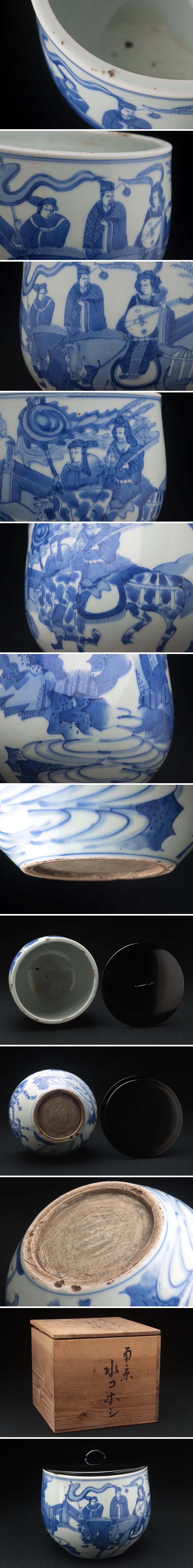 | ◆ 唐物 南京染付武将騎馬図水指 高13.5cm 塗蓋付・茶翻・青花人物故事圖水罐・青花缸 中国古陶磁 中国古玩 茶道具 古美術品 ◆