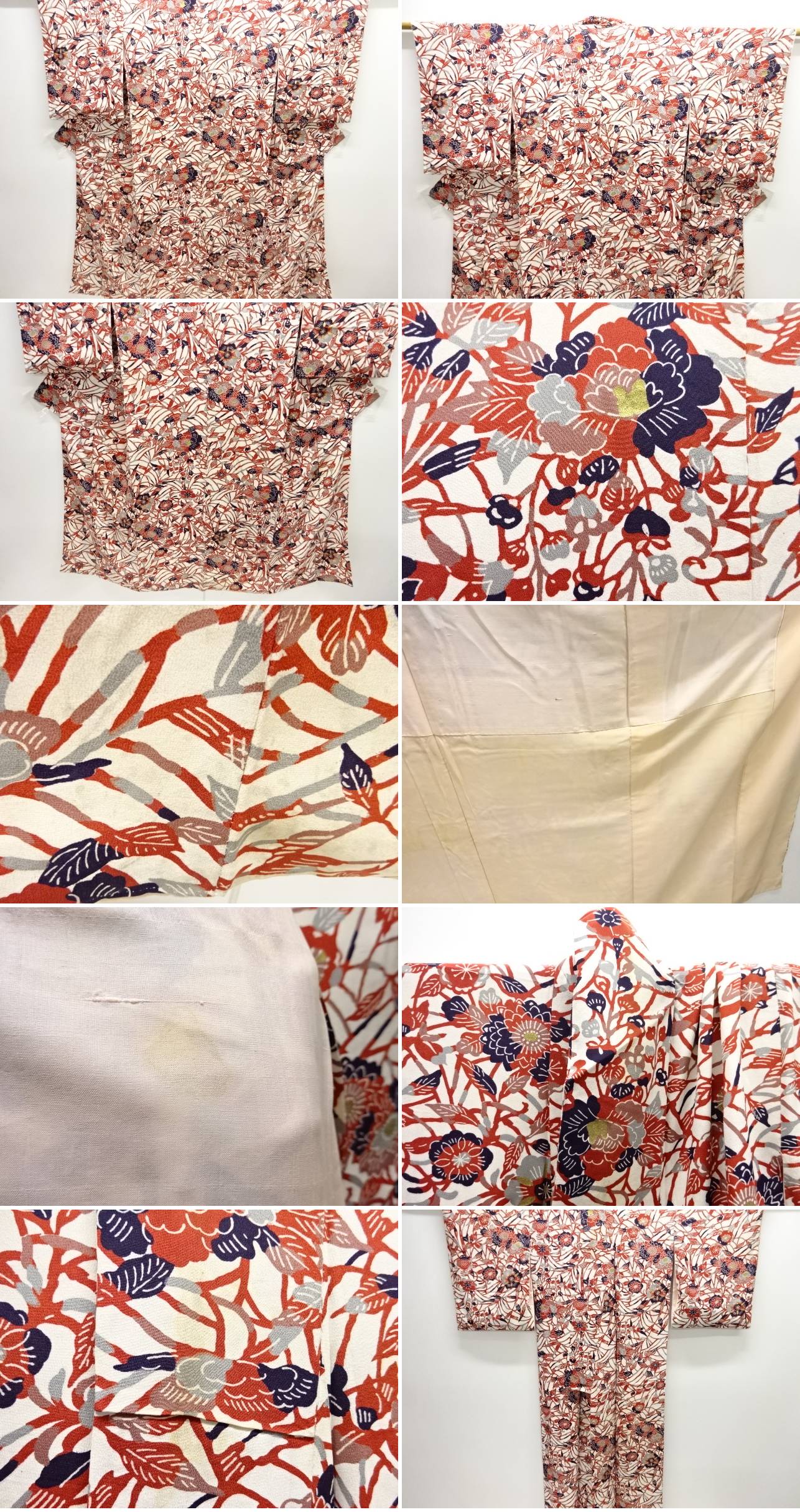 | お着物の状態をできる限りお伝えできるよう努力しておりますが、当店で出品の商品は全てアンティークになります。 一品一品丁寧に検品の上、出品させて頂いておりますが、稀に小さな見落としや、アンティーク特有の経年に伴う汚れや傷のある場合もございますので、アンティーク・中古品にご理解ある方のみのご入札をお願い致します。 寸法に関しましては、一品一品手作業での採寸であり、性質上生地の伸縮性もございますので、若干の誤差はご了承ください。 ごく稀にですが、樟脳やアンティーク特有の匂いがある場合がございます。 匂いに関しては、商品コメントには記載しておりませんので、ご理解の上ご入札下さい。 はぎれ商品につきましては、解き商品が多くなっております。 生地端に縫い糸の残りが多く残った状態での出品となります。 ご理解の上でのご入札と、ご自宅でのお手入れをお願い申し上げます。 | |