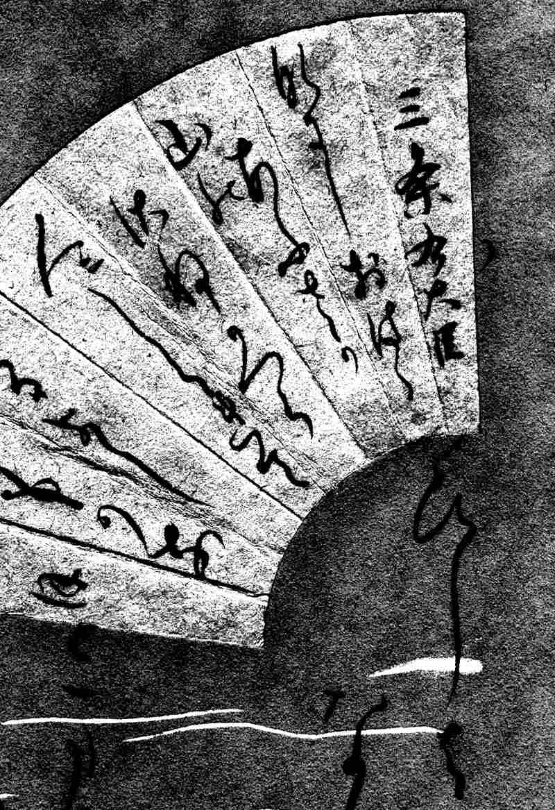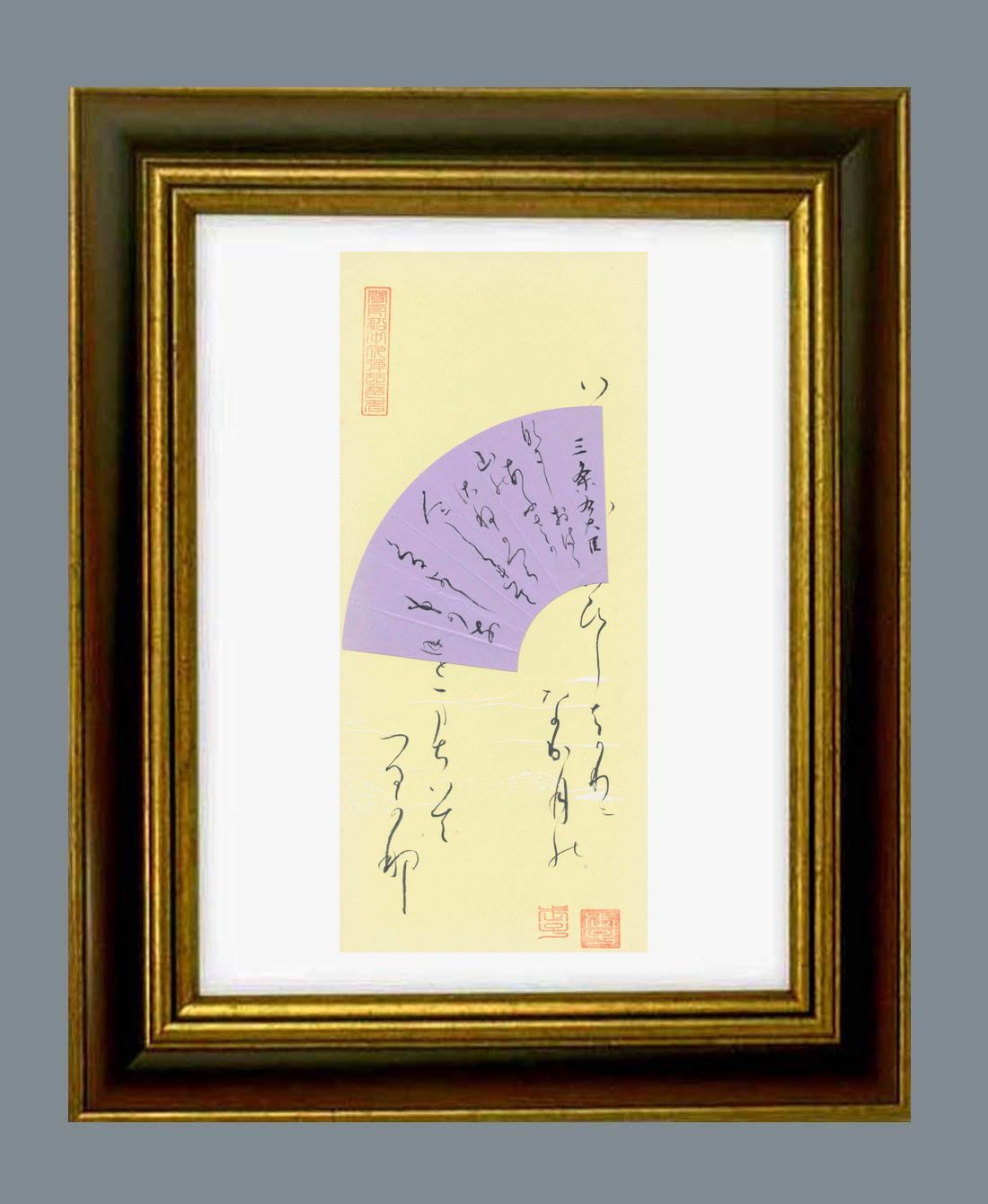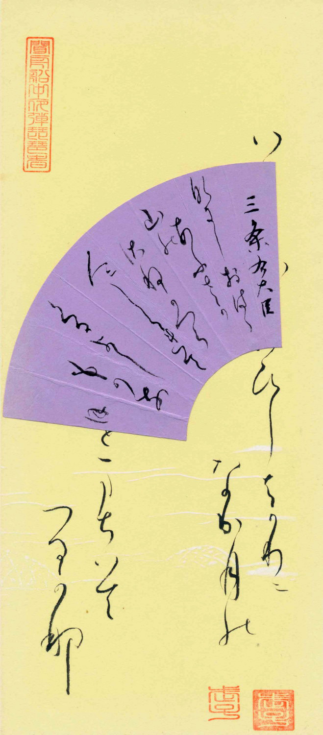 備考・原文は下書の上に扇状の和紙を乗せて上書きされております。扇状の和紙の「三条右大臣」の和歌で、下書は、性法師の和歌21番歌「いま(今)こ(来)むといひしはかりになか(長)月(つき)の ありあけ(有明)の月をま(待)ちいて(出)つるかな」の和歌です。和紙は透かし模様の特殊な貴重な和紙であるため下書が一度書かれた上に25番の和歌を扇状に重ねたものです。