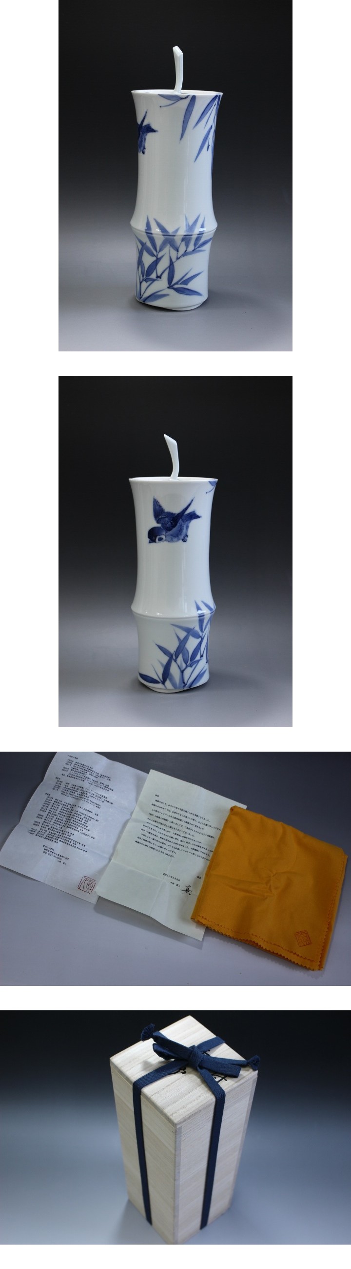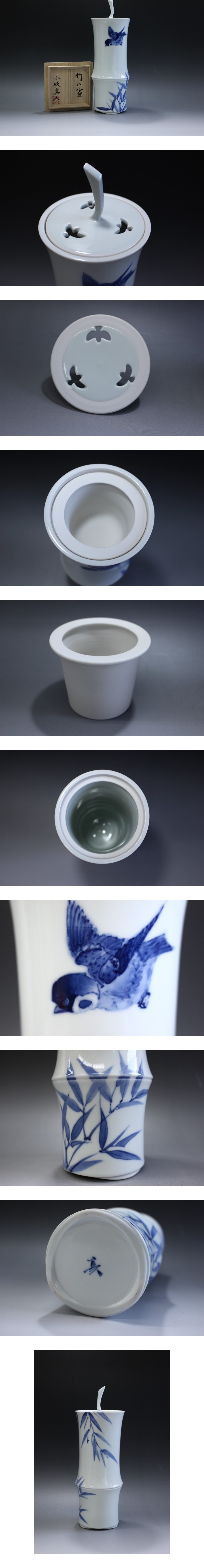 f574 技工名品 希少作 人気作家 名工 小枝真人 染付 竹に雀 香炉 高さ27.5cm 共箱 共布 栞付 未使用 美品 香道具 煎茶道具 本物保証