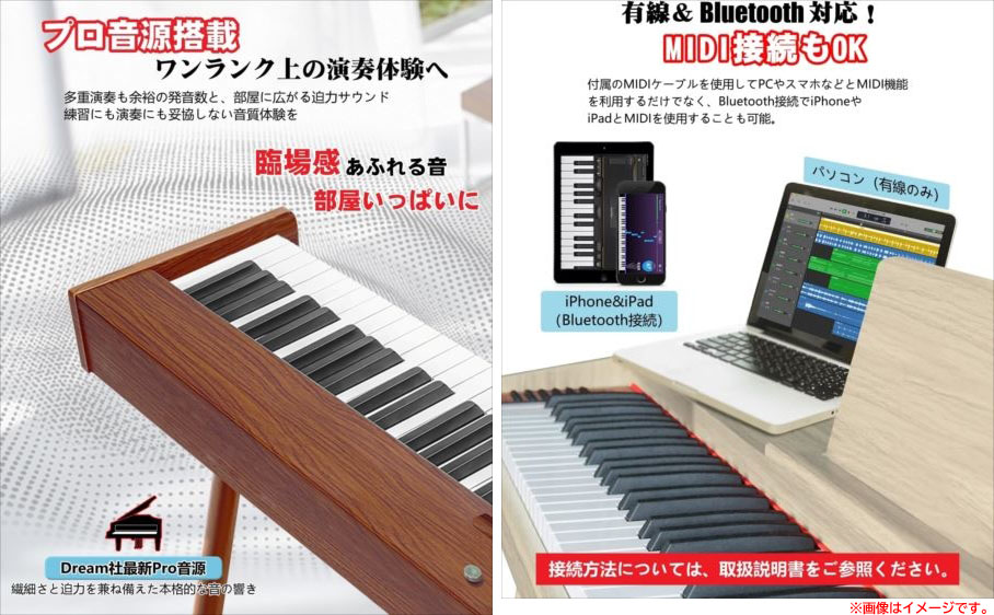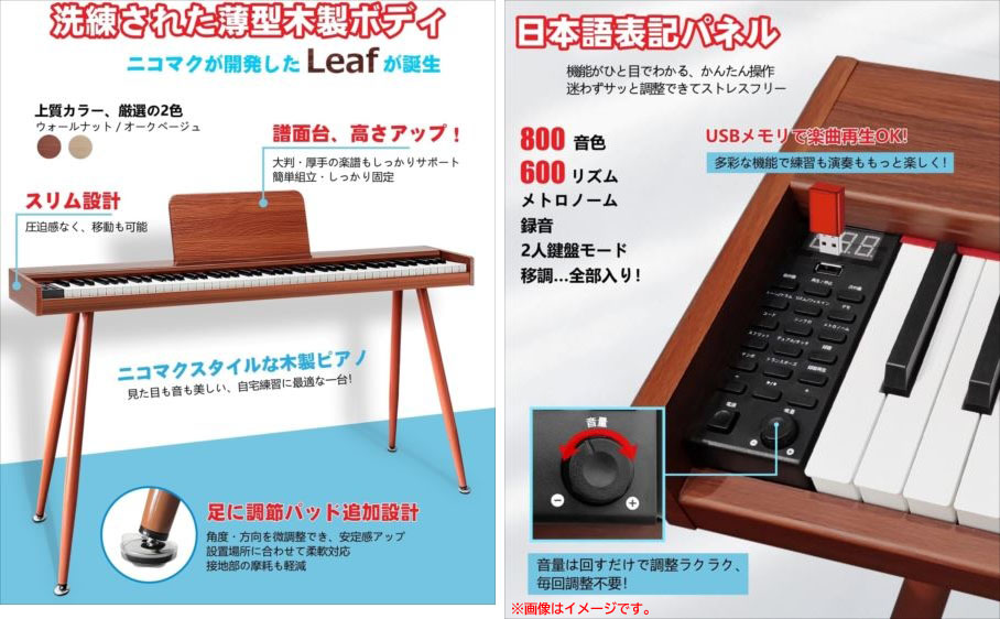 【商品特長】 ◆木製デザインLeaf スリム設計を採用し、扱いやすいサイズ感で、木製ならではの温もりと高級感を兼ね備えた新世代モデル。 省スペースで設置しやすく、お部屋にも自然と調和します。 ◆一体感あるスタンド付属 別途購入の必要がなく、すぐに演奏が可能です。 電子ピアノ本体に固定できる構造のため、演奏中のズレや転倒の心配もありません。 ◆DREAM社最新音源を採用 より繊細で臨場感のあるサウンドを再現し、豊かな音色を表現します。また、10W×2の高出力スピーカーを搭載しており、 力強くクリアな音を部屋に響かせます。また、演奏の強弱をしっかりと表現できる[タッチ感知機能]を搭載、 弾く力の強さに応じて音の大きさが変化するため、感情豊かな演奏が可能。 初心者でもタッチの強弱を自然に身につけやすく、表現力の練習にもぴったりです。 ◆直感操作!多機能日本語表記パネル 機能が一目で分かりやすく操作も簡単。音量調節は使いやすいノブ式を採用し、 複数回のボタン操作は不要で、ダイヤルを回すだけで簡単に音量を設定できます。 | |||||||||||||||||||||||||