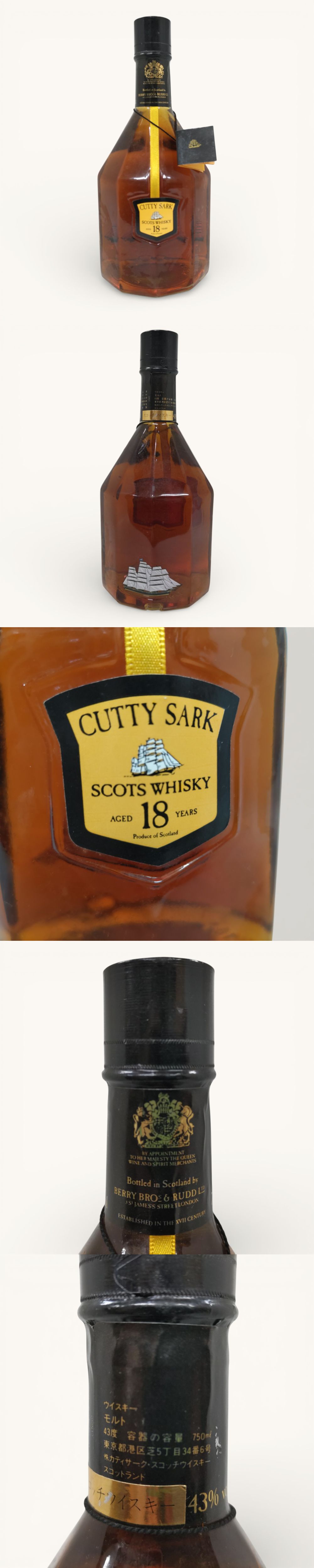 | ※必ず最後までお読みください。 Please be sure to read to the end. 一定要到最后※ | 商品概要 | 数あるオークションの中からこちらの商品をご覧頂きまして誠にありがとうございます! ※商品説明と注意事項を必ず全てお読み頂いた後にご入札下さい※ (東京都公安委員会許可 第307781505147号 古物商) 引き続き 安心できる気持ちの良いお取引を心掛けてまいりますのでどうぞ 宜しくお願い致します! 色んなジャンルの商品を多数出品しておりますので是非こちらもご覧ください!!⇒こちらをクリック ◎未開栓/古酒◎CUTTY SARK SCOTS WHISKY 18years カティーサーク スコッツウィスキー 18 年 750ml 43% 即発送 ※最下部にも写真掲載中なので必ずご覧下さい。 1923年に誕生し、世界のウィスキーTOP 10にランクインされるビッグブランド。 グレンロセス、マッカラン、といったスペイサイド地方のモルトを主に使用した、まろやかで上質な仕上がりが特徴です。 カラメル着色しない、ライトでスムーズなブレンデッドウィスキーとして、1923年に開発されて以来、全世界にその「飲みやすさ」が広く受け入れられています。 名前の由来は、お茶を中国から運ぶティー・クリッパー・レースで大活躍し、世界最速の船として快速ぶりを発揮していた快速船『カティサーク号』から。 歴史的で冒険心に富んだイメージにピッタリだったカティサーク号は、このウイスキーの名にぴったりでした。 CUTTY SARKとはスコットランドの古語ゲール語で「短いシミーズ」の意味。 【種 別】スコッチウィスキー 【商品名】CUTTY SARK SCOTS WHISKY 18years 【容 量】750ml 【度 数】43度 【原産国】スコットランド 【状 態】必ず写真をご確認ください。 【詳細・備考】 当方譲り受けたお品になります。本文と写真が異なる場合は写真を正とします。 古酒になりますので自宅保管で経年の保存による、量減りや風味の変化等は保証しかねますのでご了承ください。 又、当方でしっかり梱包しますが、未開栓品でも稀に発送後に液漏れなどがある場合がございますが、 当方では保証できかねますのでご了承ください。 経年保管による多少の擦れや汚れ等はご了承下さい お酒になりますので、未成年の方は入札できません。 落札後、生年月日のご連絡をお願い致します 状態判断には個人差があることを予めご了承の上 写真にてご確認ご判断お願い致します。 写真に写っている物が全てになります。 尚 デジカメの画像は鮮やかになりますので、 実際のカラーとモニターを通じた色彩は異なりますのでお気をつけ下さい。 よくご確認、ご了承の上、ご入札お願い致します。 新品に近いものをご希望の方や神経質な方のご入札はお控え下さい。 ご入札頂いた時点で商品にご納得して頂いたと当方で判断させて頂きます。 【ノークレームノーリターンでお願い致します】 【当方のオークションでは いろんなジャンルで多数出品しております】 是非ご覧ください☆ ![]() ▶入札の取り消しは受け付けておりません。 落札後の質問やキャンセルは受け付けておりません。 オークション終了間際や質問内容によっては返答できない場合がございます。 ジャンク商品に関してはいかなる場合も返品返金の対応はできかねます。 落札後のサイズ違いやイメージ違い等のキャンセル、クレーム、返品等はお受けできませんので予めご了承ください。 ご入札の方につきまして、当方にて評価が著しく悪いと判断した場合は、トラブル防止の観点からご入札を取り消させていただく場合がございますので予めご了承ください。 新規IDの方や、いたずら入札と判断した場合、入札削除させていただく場合がございますので、 新規の方は質問欄にて購入意思を示してからのご入札をお願い致します。 取り置きは可能ですが物や金額によってはすぐに決済をお願いする場合がございます。 当方大量の商品を管理している為、複数落札の同梱ご希望の方は、まとめて取引の依頼を必ず使ってください。 ◆連絡方法◆ ▶当方連絡事項は全て取引ナビを使用しております。 ご連絡先、ご要望等は必ず取引ナビにご入力お願い致します。 ⇩⇩下記の注意事項を必ずお読み下さい。⇩⇩ |