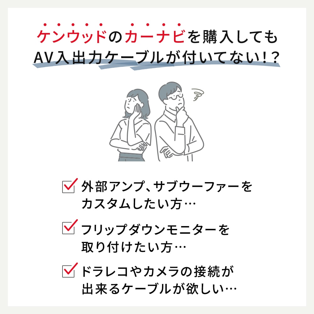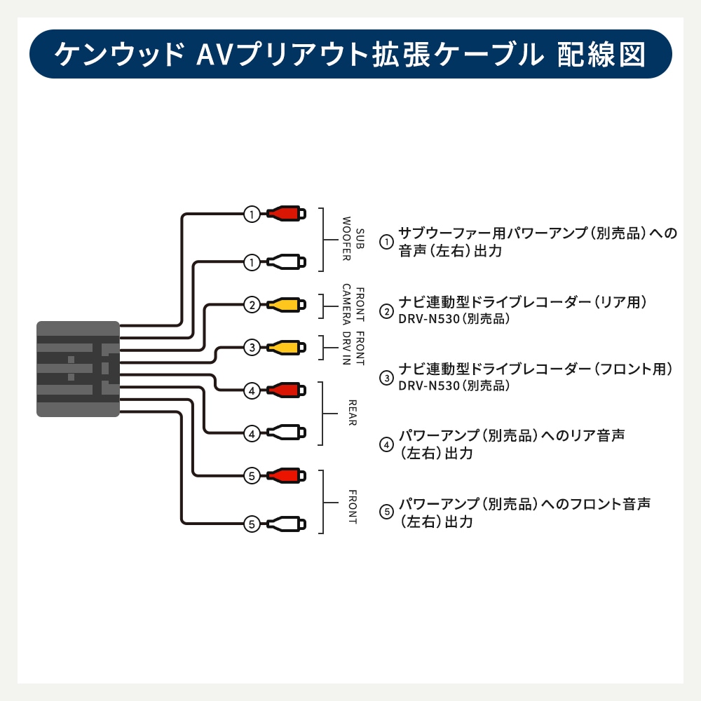 | ケンウッド KNA-25AV互換 汎用オーディオ拡張ケーブル オーディオ系のカスタムに必須のAVプリアウト拡張ケーブル 適合ナビ一覧 2025年モデル MDV-MX12F MDV-M912F MDV-M912L MDV-M812F MDV-M812L MDV-M712W MDVM712 詳細は適合表画像をご確認ください。 こちらの商品はKENWOOD純正品ではございません。 お取り付けに関するサポートは行っておりませんのでご了承ください。 また、取り付けたことにより発生した事故・故障・損害は一切保証できませんので、 お取り付けは整備工場などで行い、あくまで自己責任のうちで取り付けを行ってください。 (作業ミスなどの責任は負いかねます) ![]() 適合表に記載以外の機種の適合情報は当店ではわかりかねます |