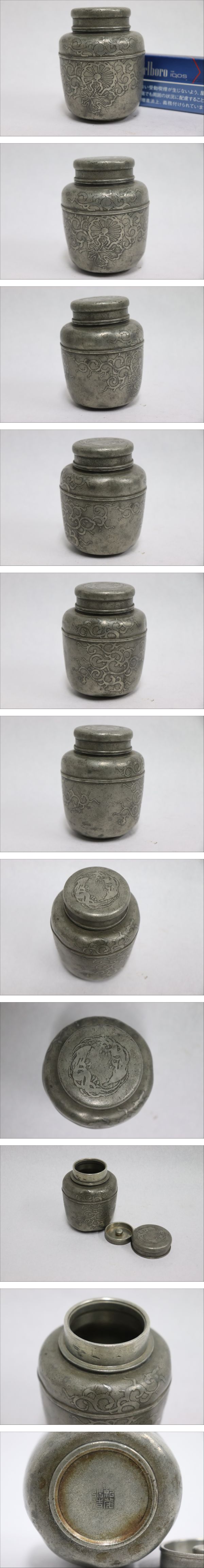 | 商品説明 | 商品名 中国古玩 唐物 古錫製 茶心壺 茶入 在銘 付属品:なし。 サイズ 高さ9㎝、高さ4.4㎝、底径4.3㎝。 状態: 時代のスレ、汚れ、小疵あり。 |
