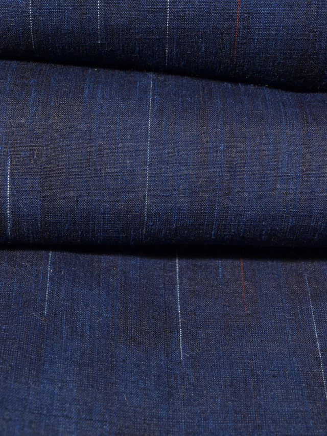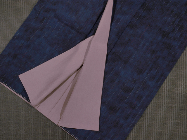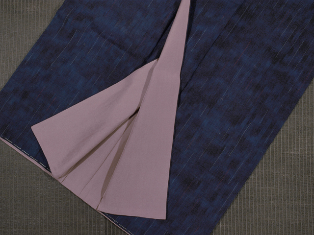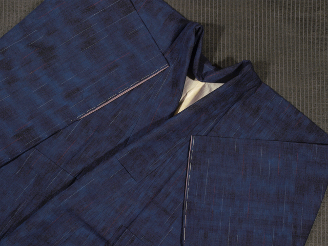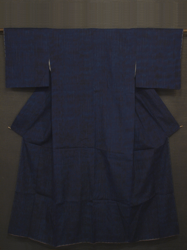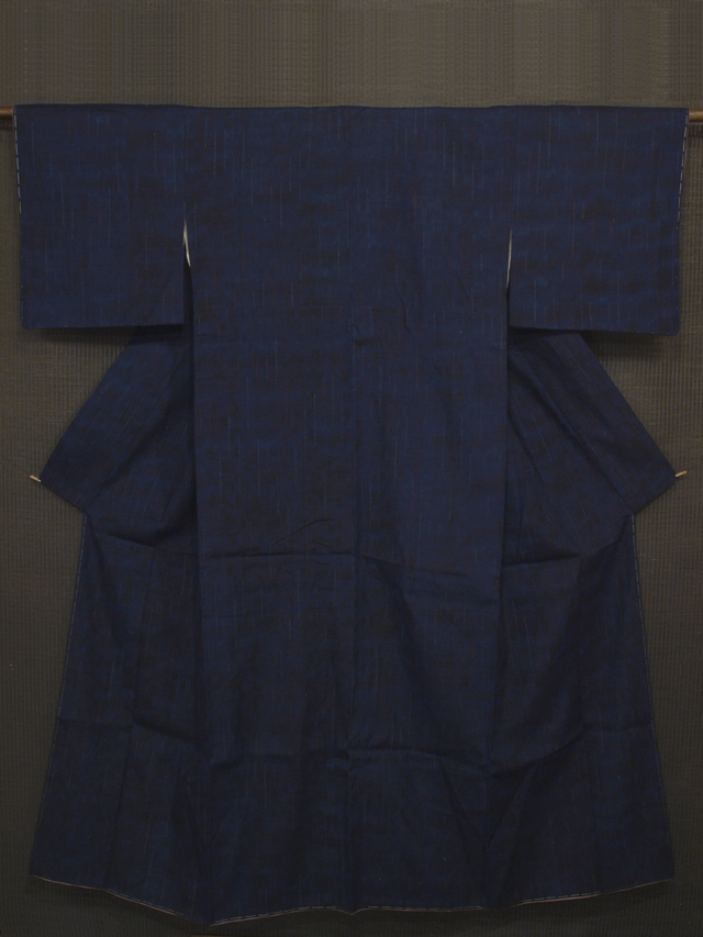 全体的な印象としては濃淡のぼかしのある紺青(こんじょう)色といった感じの地に、絣で白藍(しらあい)色と赤色の雨縞の文様が織り込まれている紬です。袷仕立てです。 とても粋な意匠です。ほっこりとした紬らしい手ざわりの紬地です。 しつけ付きの仕立て上がり未使用保管品ですが、胴裏が全体的にうっすらと黄変気味で、胴裏の衿先や背縫い付近に黄変がポツポツとあります。そのほかに目につく大きなしみやよごれ、褪色などのダメージはなく、表地はとてもきれいな状態です。 |