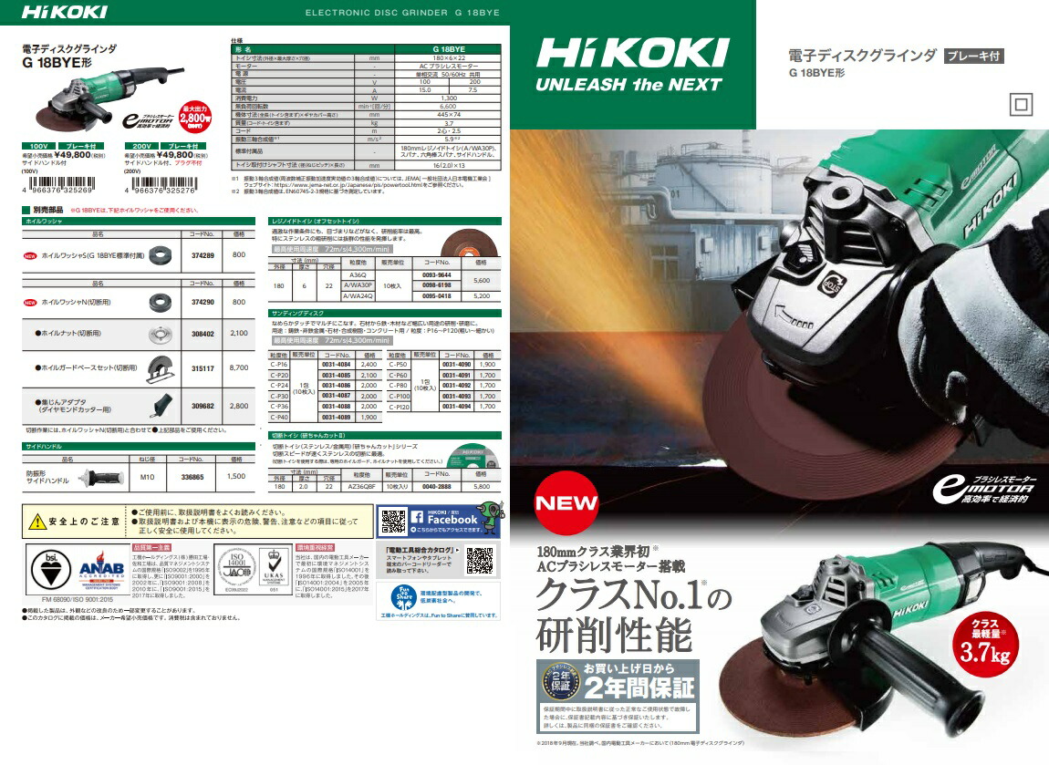 HiKOKI ハイコーキ180mm 電子ディスクグラインダ(ブレーキ付) G18BYE※販売はタイトルの仕様(形名)です。