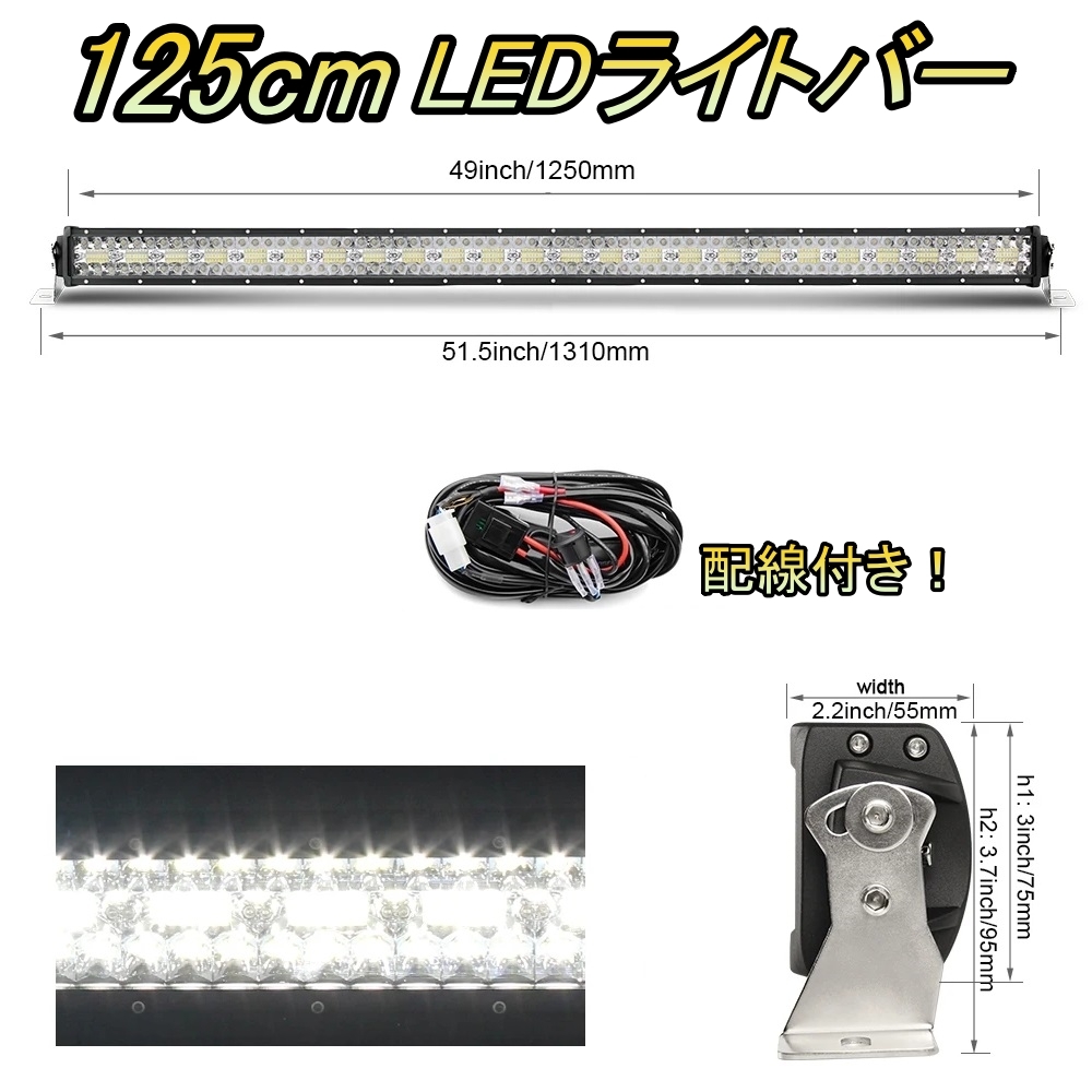 | 商品内容 LEDライトバー(125cm) ストレートタイプ 特徴 発光色:ホワイト 対応電圧:12V/24V 消費電力:936W 色温度:6,500K 防水・防塵性能:IP68 (防水/防塵ともに最高性能) 動作温度:-40℃~85℃ 動作寿命:50,000時間以上 全体サイズ:1,310mm 照明部サイズ:1,250mm 付属品:固定用ステー/配線 適合確認 タイトルの車種情報をご確認ください。 ※タイトルにある車種以外でも12V/24V車であればご使用可能です。 ※タイトル車種は弊社で12V及び24Vであることを確認した車種になります。 |