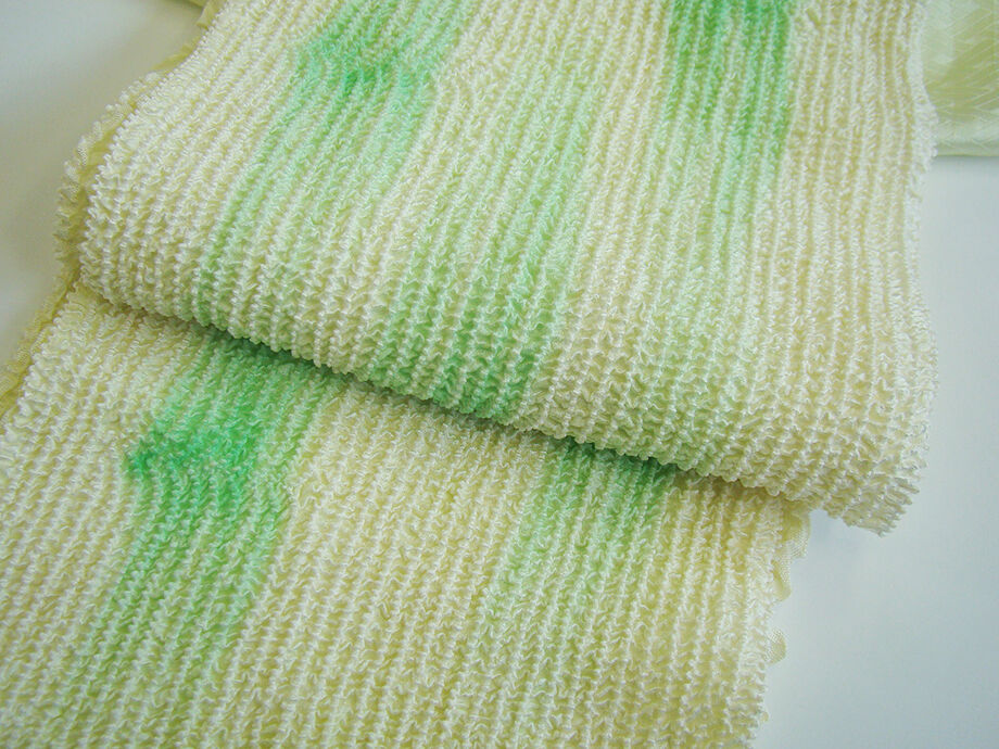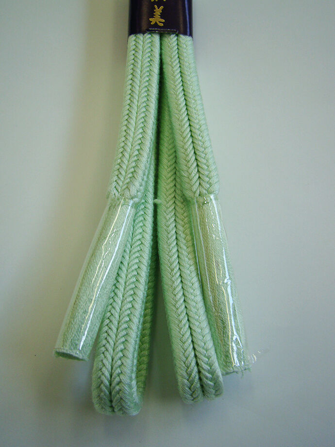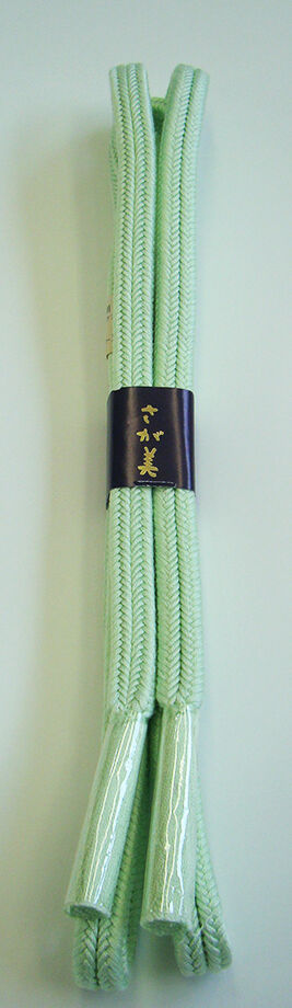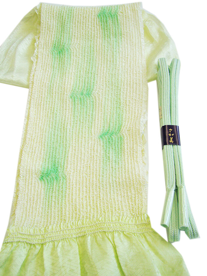 ●帯揚げ: 正絹。 しなやかなしっかりとした絞りの帯揚げ、 薄い若芽色地に緑色の染に絞り入り。 ●帯〆: 正絹。 ゆるぎ組の帯〆。 淡い白緑色の組紐。 |
