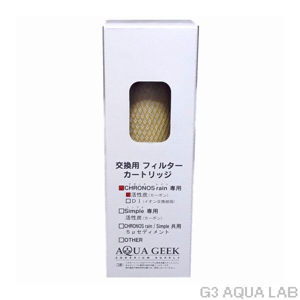 こちらの商品の最安送料による発送方法はレターパックプラスとなります。外箱サイズが大きく封筒に入らないため、外箱を折りたたんだ状態での梱包となります。レターパックのお届けは、通常1-3日程度要します。お急ぎの方は宅配便を選択下さい。レターパックは、追跡番号あり、捺印による対面受け渡しとなります。破損補償なし、代引き不可、時間指定なしとなりますのでご注意ください。ハートトレードのアクアリウム用浄水器【クロノスレイン】は、5μセディメント、無リン活性炭、逆浸透膜、イオン交換樹脂の4種類のフィルターモジュールで構成されたコンプリートモデルとなります。水道水に含まれる不純物(サビ、溶存塩素、重金属、コケの栄養素など)を高精度に取り除き、限りなく純水に近い水を生産します。カーボンフィルターがリン酸を放出すればメンブレンとイオン交換樹脂には不必要な負荷をかけ続ける事になるため、特殊に作られたカーボンです。メーカー:ハートトレード アクアギーク AQUA GEEK商品名:リン酸カット カーボンフィルター CHRONOS専用対応機種:クロノスレイン