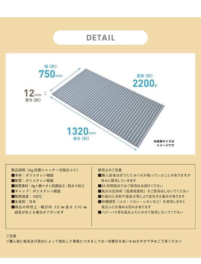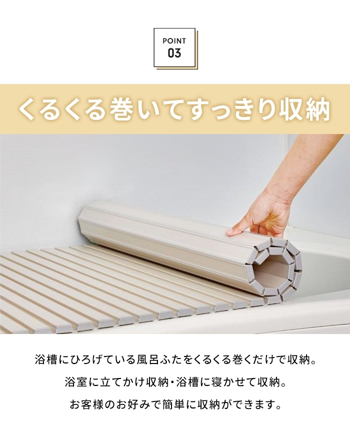 | Ag抗菌シャッター式 風呂ふた。 〔POINT〕Ag抗菌加工&防カビ加工 繋ぎ目にAg+銀イオン抗菌加工が施してあり、菌やカビによる嫌なヌメリの繁殖を抑えて風呂ふたをきれいに保ちます。 〔POINT〕毎日のお風呂掃除が簡単に 表面の溝に沿って軽く洗って水を流せばお掃除完了。 (風呂ふたを洗う際は柔らかいスポンジや中性浴室用洗剤を使用してください。) 〔POINT〕くるくる巻いてすっきり収納 浴室にひろげている風呂ふたをくるくる巻くだけのシャッタータイプ。 クルッとまとめられるので収納スペースが少ないお風呂場にぴったり。 〔POINT〕軽量設計 毎日使うものだから軽量でストレスフリーな使い心地。 軽量なのでお子様からお年寄りの方でも簡単に扱えます。 〔POINT〕安心・安全の日本製。 【使用上のご注意】 ◎購入直後は折りたたみクセが残っていることがありますが、徐々に解消していきます。 ◎24時間風呂ではご使用をお避け下さい。 ◎風呂水洗浄剤(塩素殺菌剤)をご使用しないでください。 ◎柑橘類(柚子・みかん・レモンなど)を使用しますと風呂ふたを傷める恐れがあります。 ◎ベビーバスなどを風呂ふたに乗せて使用しないでください。 |