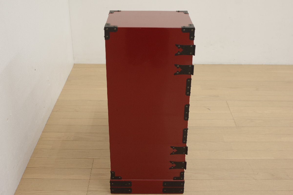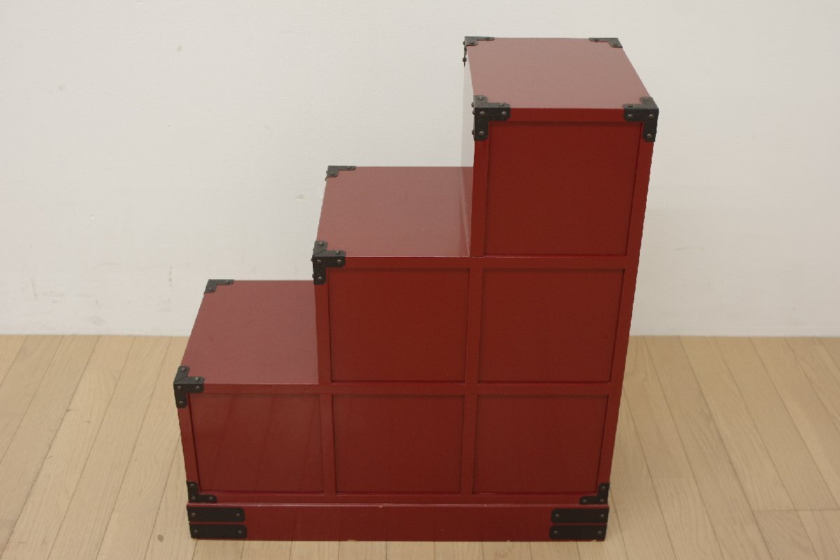 【商品紹介】 朱漆塗 階段箪笥 のご紹介です。 朱色が目を引き、黒鉄金具が際立つデザインのステップ箪笥。 引き出しや収納棚があり小物の整理にとても活躍しそうです。 インテリアのワンポイントになる素敵な家具です。 この機会にぜひご検討下さい。 【コンディション】 使用品です。 ・フレームには落としきれない汚れがございます。 ・一部金具が緩い箇所がございますがご使用には問題ないです。 ・木部には剥がれや塗装の剥げ擦れキズ等がございます。 目立つような大きな傷はなく、まだまだご愛用頂けるお品ですが使用品であることご理解の上ご検討下さい。 ※清掃、撮影時に目立つ箇所は写真掲載しておりますが、同等の傷などがあるものとご了承ください。尚、商品ページの掲載写真にて状態をご確認の上、ご検討いただけますようお願いいたします。 この他にも商品を多数出品しておりますので、こちらから御覧下さい。 | ||