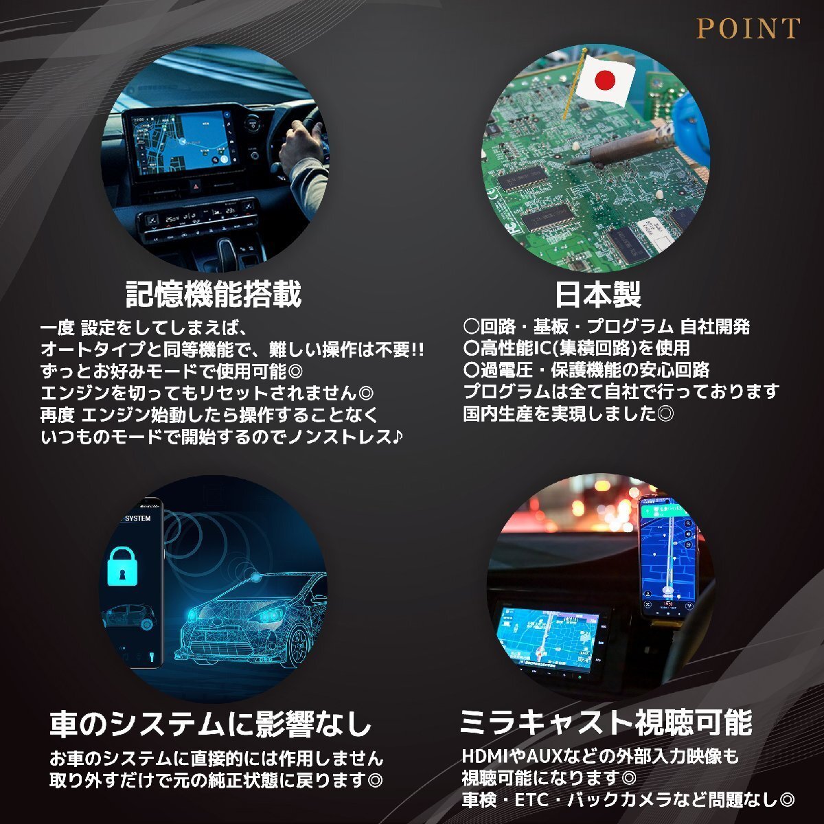![]() ![]() ■トヨタ純正ナビ/メーカーオプション コネクティッドナビ対応 ディスプレイオーディオ/ディスプレイーディオPlusを 走行中に【テレビ・DVD視聴、ナビ操作、ルート案内】が 可能になるテレビナビキットです。 ■簡単取り付けのカプラーオンタイプ 当店のテレビキットは完全カプラーオン! ■テレビキャンセラーを取り付けても 法律はもちろん、車検にも合格します。 カーナビの通常の機能(バックカメラやETCなど)を 損なうことはございません。 ※テレビナビキットの性質上 以下の現象が生じることがあります。 予めご了承ください。 ・ルート音声案内が、通常時より早めに通知されます ・ナビ上の自車位置表示の精度が若干落ちてしまいます ・ナビの動きが通常時より少しカクカクした動きになります ※本製品は同乗者の方の使用を目的としている商品です。 運転者が画面を凝視することは 安全運転義務違反になりますので、絶対におやめください。 ※商品のデザインは品質向上のため、 予告なく変更する場合がございます。 ![]() ![]() | |