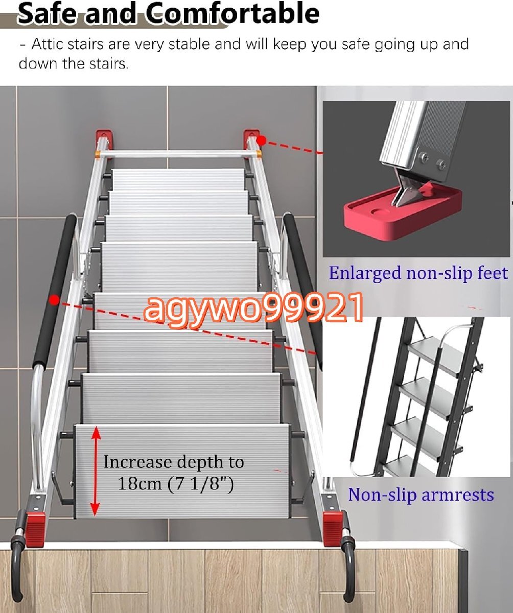 【 厚手のアルミ合金 】: 屋根裏階段はしごは高強度アルミ合金製で、屋根裏階段の耐荷重性を高め、長期間使用しても安定して変形しません 頑丈な避難はしごをお探しなら、これが第一の選択肢となることは間違いありません。多用途で耐久性に優れたこの緊急用はしごなら、安全に登ることができます。仕様:- 素材: アルミニウム合金- 色: シルバー、ブラック- オプションの長さ: 257 cm (101 1/8")、275 cm (108 1/4")、293 cm (115 3/8")、320cm (126")、349cm (137 3/8")、375cm (147 5/8")、404cm (159")- 幅: 50 cm (19 3/4")- ステップの深さ: 18cm(7 1/8")パッケージ内容:- 屋根裏脱出用はしご x 1(取り付けアクセサリ付属)特徴:- アルミニウム素材は丈夫で耐久性があります。- 耐荷重 150kg / 330ポンド。- 安定していて滑りにくく、落下しません。- 場所を取らない折りたたみ式デザインスペースに余裕があります。- フックの角度は調節可能です。- さまざまな場面で使用できます。注意:- ディスプレイや光の違いにより、写真と製品の色に多少の違いが生じる場合があります。- 手動測定のため、1?2 cmの誤差があり、実際のサイズが優先されます。