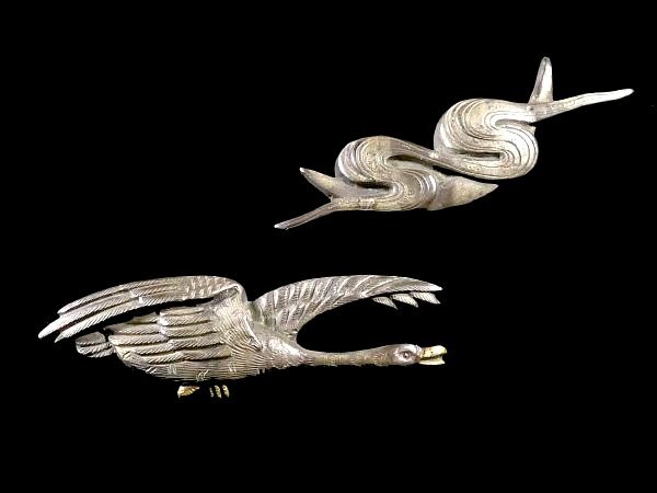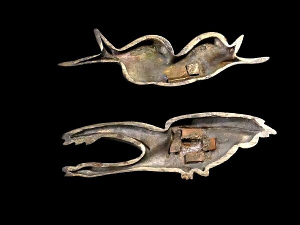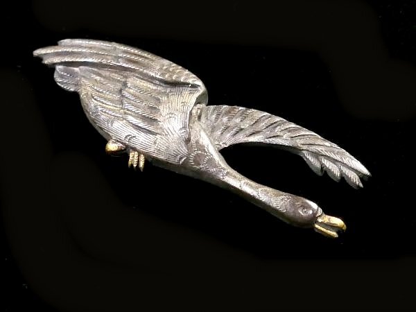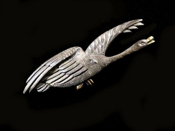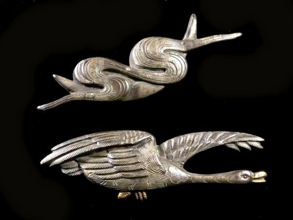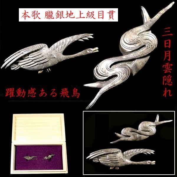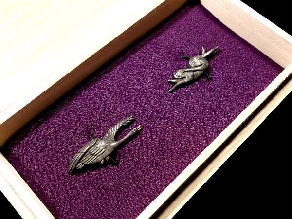| 商品説明 | 繊細な細工技術により 雲に隠れる三日月と その光を頼りに飛ぶ鳥の図が施された 雰囲気の良い、趣深き一品です。 材質・細工共に上手の一品であり 生まれの良さそうな作品と存じます。 お好きな方、この機会に是非手に入れて下さい。 【繊細な細工】 【趣ある構図】 【雰囲気良き一品】 寸法: 約 3.80cm × 約 1.16cm 約 3.80cm × 約 1.00cm 時代: 江戸時代 材質: おそらく朧銀地と思われますが四分一地かもしれません。 いずれにしましても良い材質です。画像にてご確認下さい。 桐箱付 銘 : 無銘 状態:特に気になる大きな傷みはなく概ね良好。 画像にてご判断下さい。 :許容範囲内の時代傷みはご理解下さい。 |