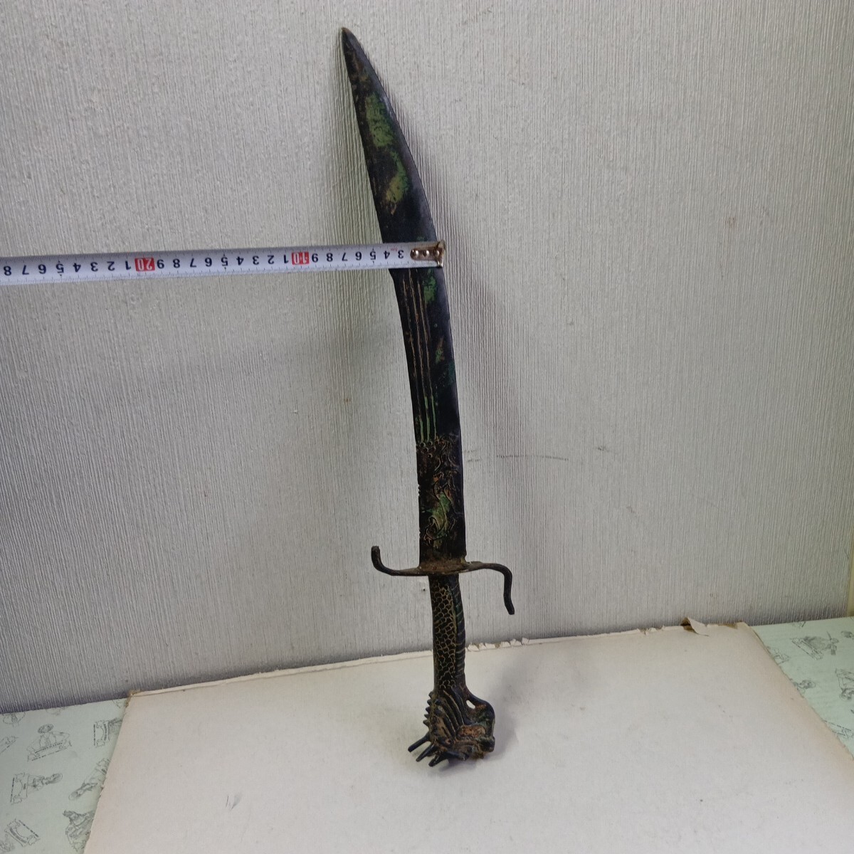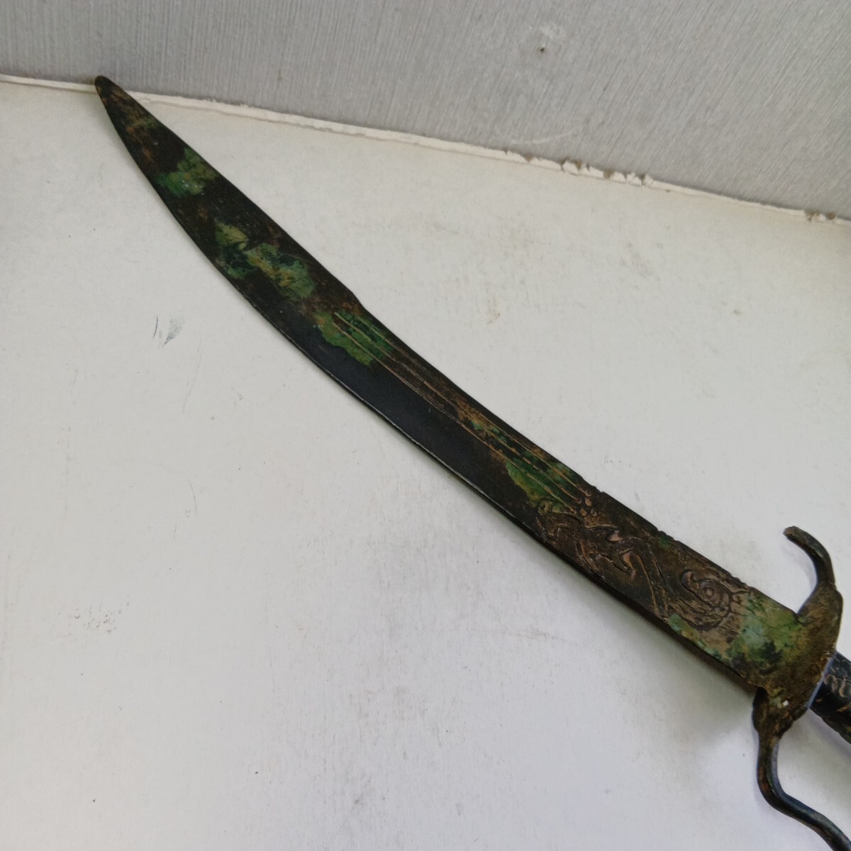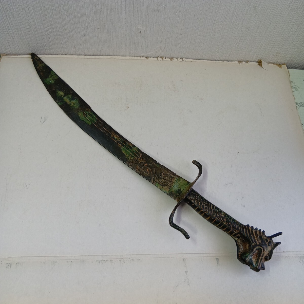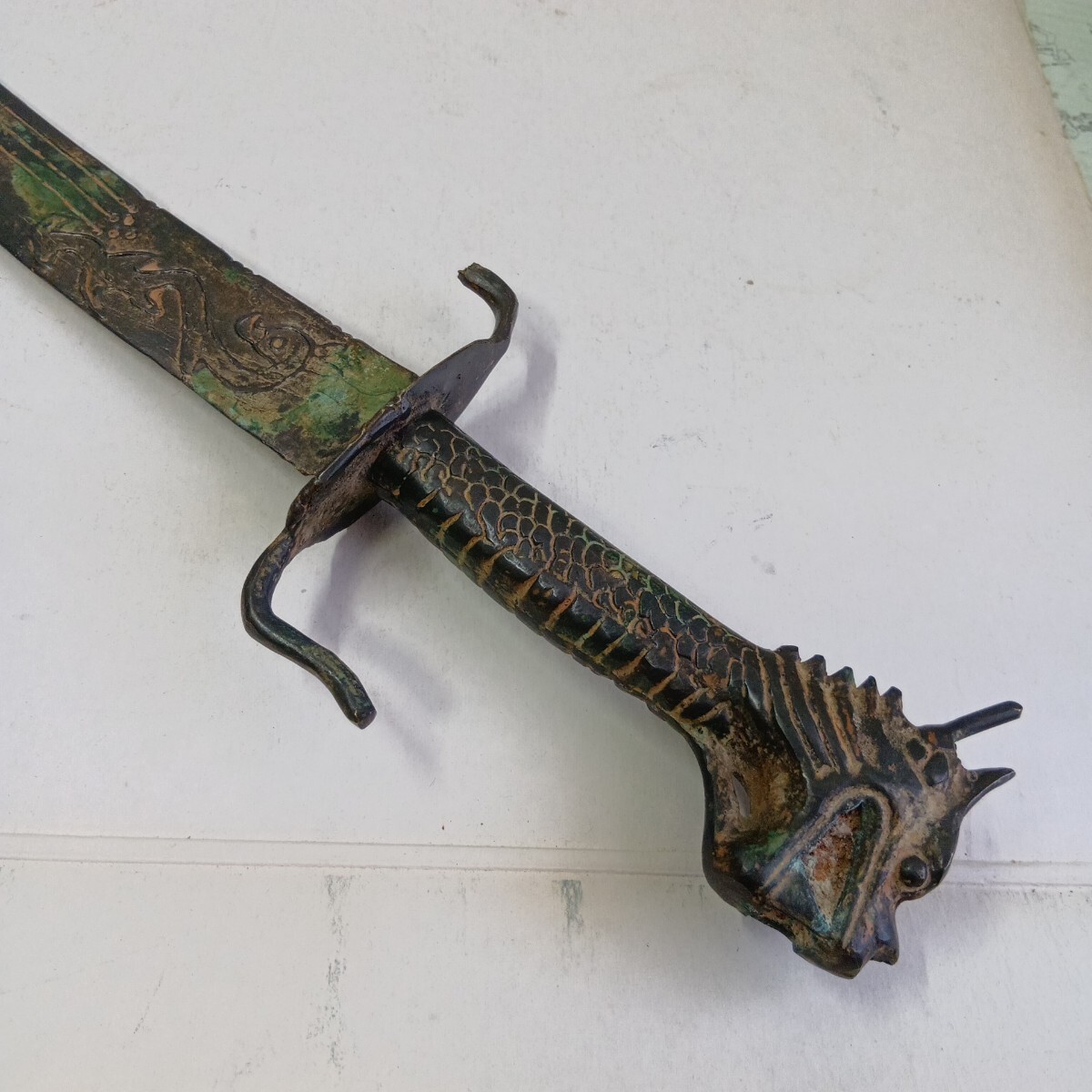 模造刀 中国古美術 アンティーク 青錆汚れ有り 現状品 全長52.5cm 刃長さ約38cm 重さ630g 材質真鍮製 良く画像をご覧頂き入札をお考え下さい。