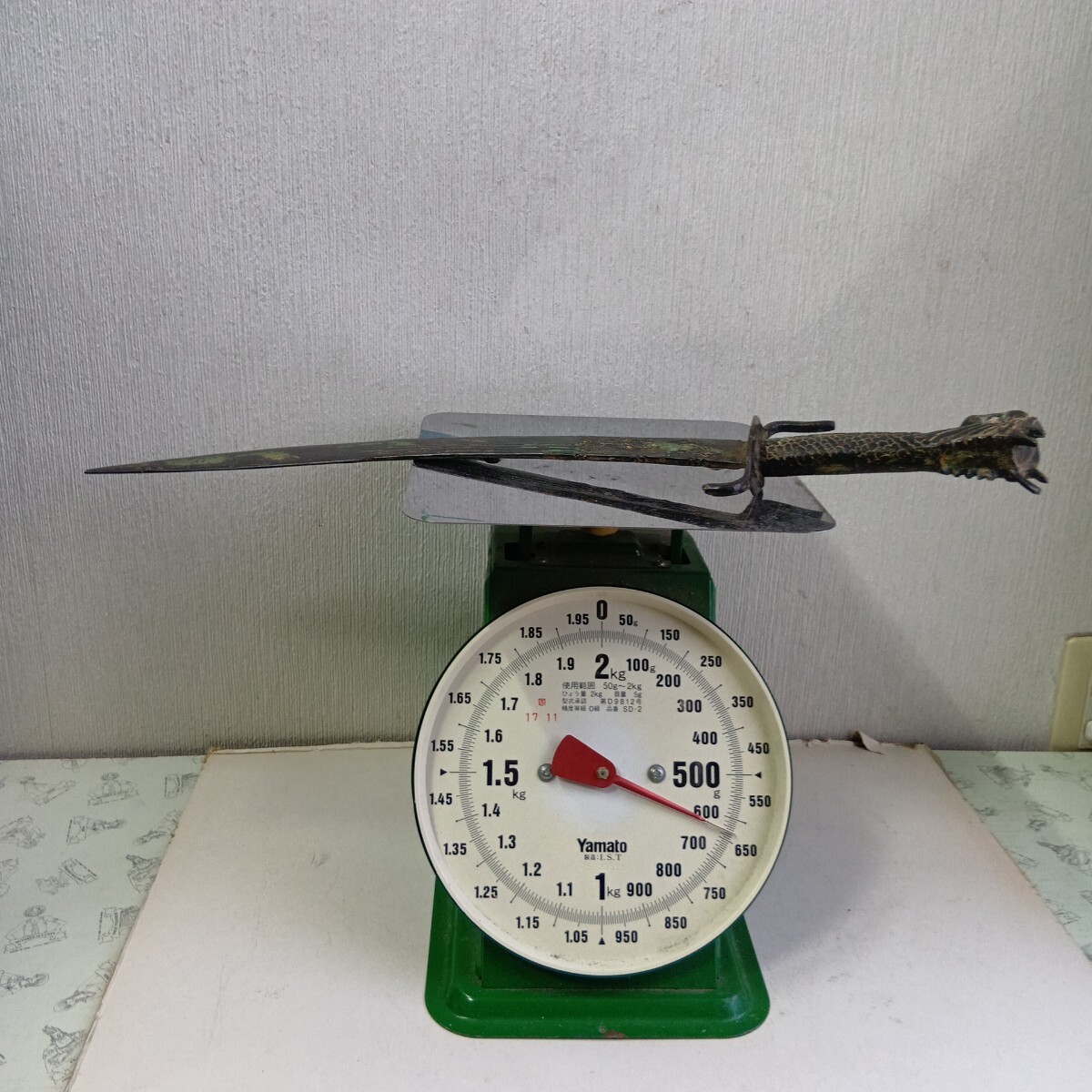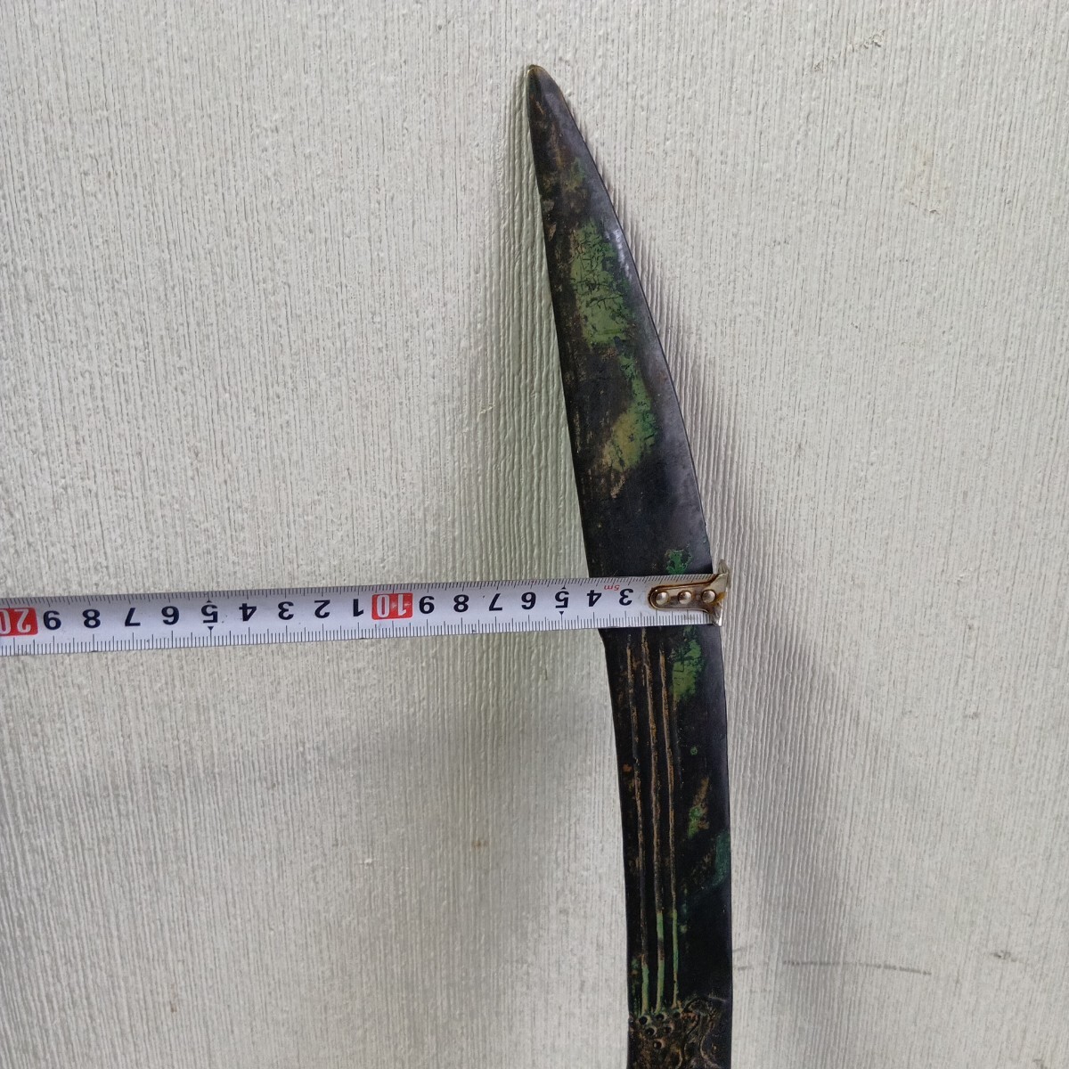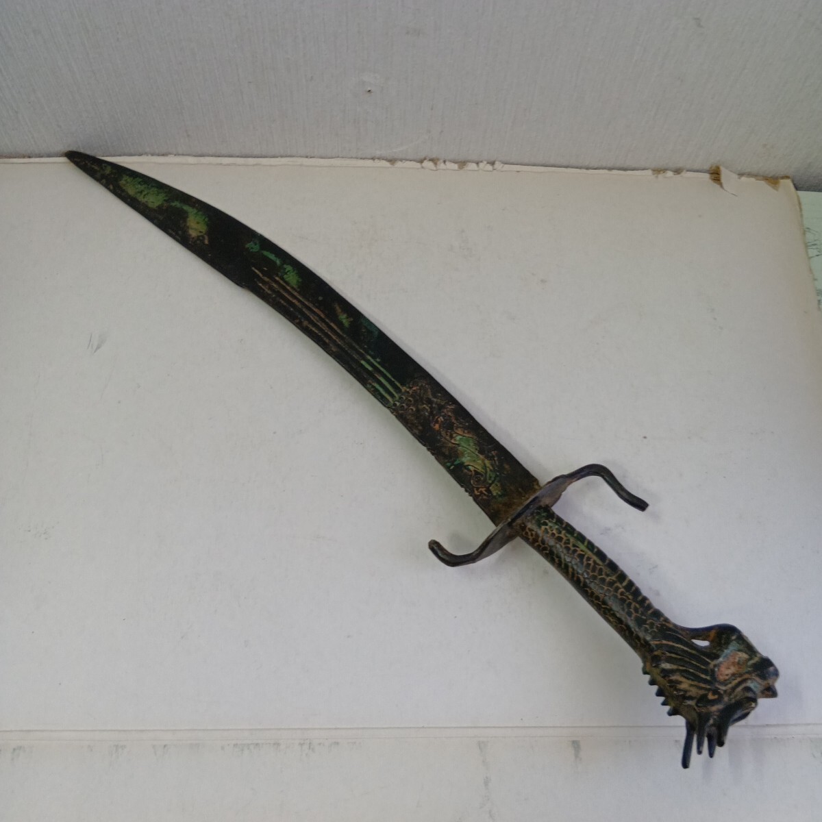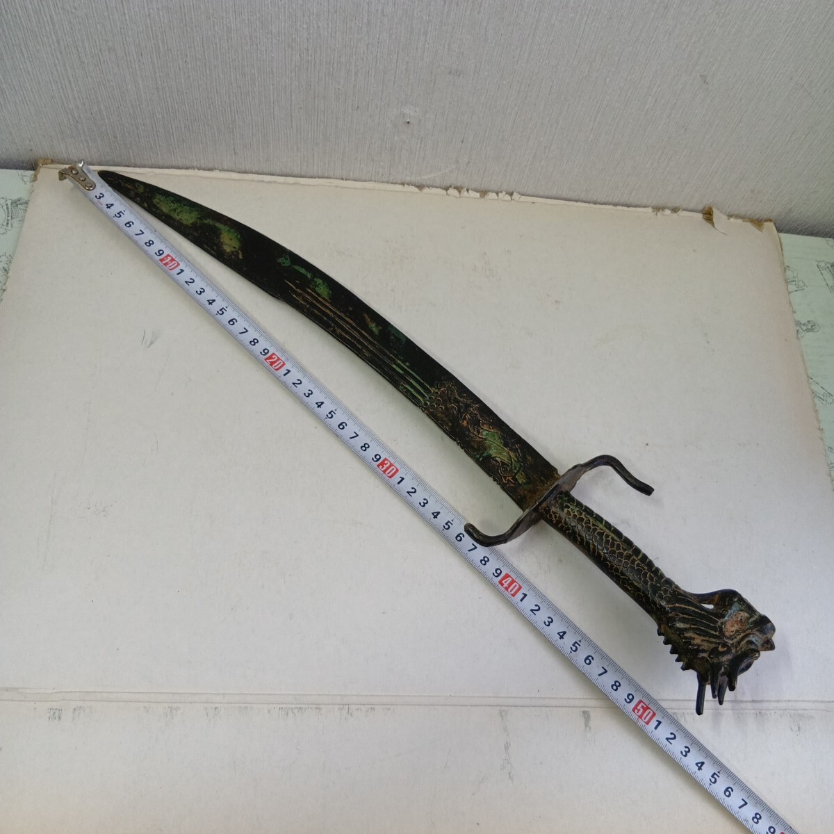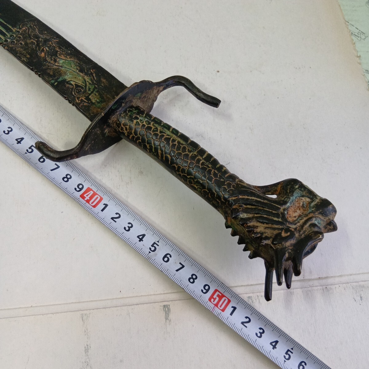 模造刀 中国古美術 アンティーク 青錆汚れ有り 現状品 全長52.5cm 刃長さ約38cm 重さ630g 材質真鍮製 良く画像をご覧頂き入札をお考え下さい。