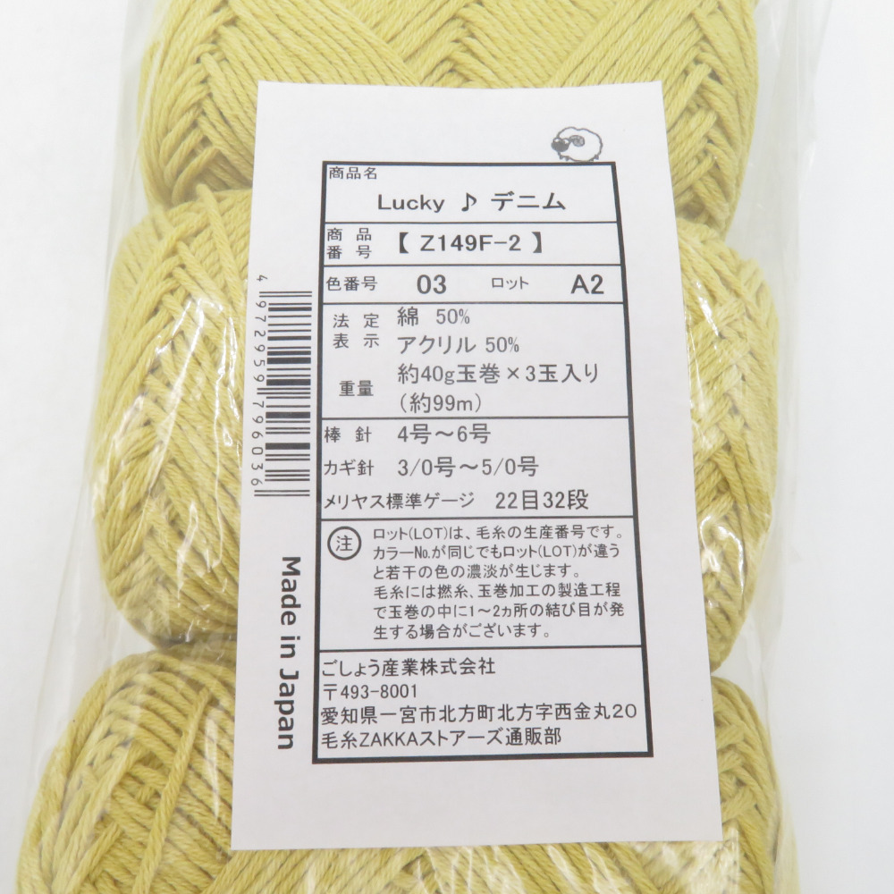 | 毛糸 毛糸ZAKKAストアーズ Lucky(ラッキー)♪デニム 9玉セット 3番色 1玉40g 約99m 合太 日本製 春夏毛糸 イエロー 未使用品 |