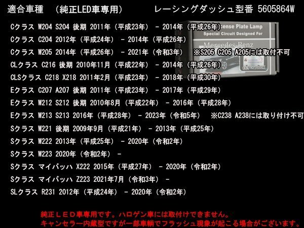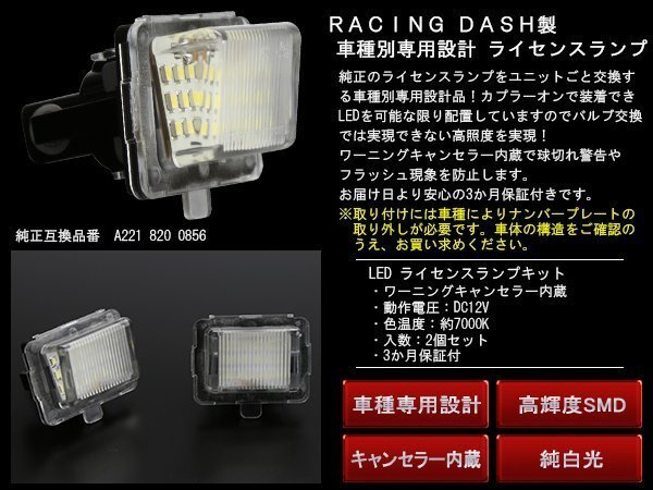 純正のライセンスランプをユニットごと交換する車種別専用設計品! カプラーオンで装着できLEDを可能な限り配置していますのでバルブ交換では実現できない高照度を実現! ワーニングキャンセラー内蔵のため、球切れ警告も防止します。 色温度も約7000Kの純白で愛車のリアビューをスタイリッシュに演出します。 お届け日より安心の3か月保証付きです。 その他、レーシングダッシュ製品は⇒ こちら | ■ レーシングダッシュ型番:5605864W ■ ワーニングキャンセラー内蔵 ■ 動作電圧:DC12V ■ 保証期間:到着日より3か月間 ■ 色温度:約7000K ■ 入数:2個セット 純正品と同様の結露の発生や少量の水滴の侵入、お客様の取り扱い上による破損及び加工改造等を行った物は保証対象外です。 保証はあくまで製品本体の保証であって、取付け工賃や製品使用から生じたいかなる損害に関しては当店は一切の責任は負いません。 | |
