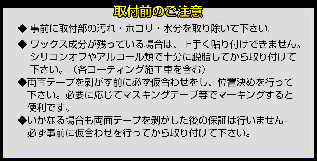 60系プリウス専用設計のドアハンドルプロテクタ。 両面テープで貼るだけでドアハンドル操作時のスクラッチ傷や汚れからボディを保護するだけでなく、ドレスアップパーツとしてもおすすめ。 あらかじめ両面テープがセットされてるので届いて直ぐに取り付けが可能。 フロント、リアのセットです。 必ず事前に仮合わせを行って下さい。 いかなる場合も両面テープを剥がした後の保証はお受けできません。エッジ部でケガをしないようご注意下さい。 | ■ 商品:ドアハンドルプロテクタ ■ 適合車種:プリウス ZVW60/65 MXWH60/65 ■ 材質:ABS樹脂 ■ カラー:ピアノブラック ■ 入数:1台分セット その他、60プリウス用パーツは⇒ こちら | |