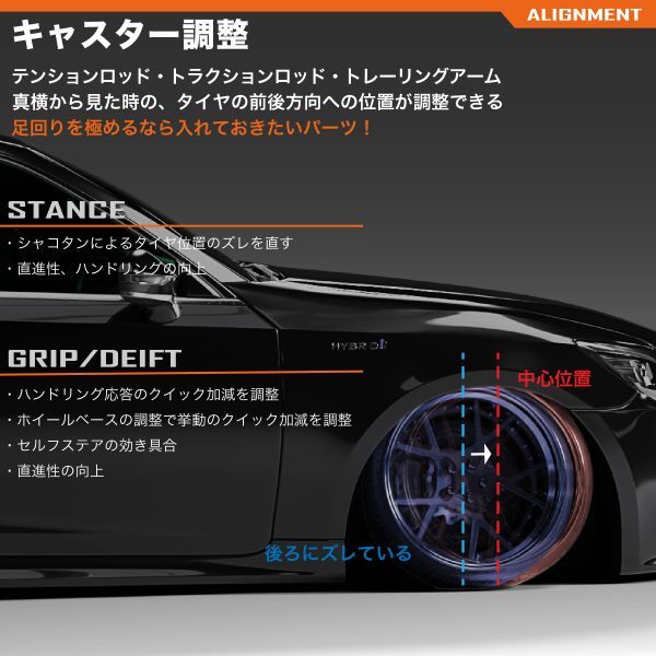 対応車種 ・S14/S15 シルビア ・C34/C35 ローレル ・Y32/Y33 シーマ ・34ステージア 調整幅 ・- セット内容 ・左右1セット、試験成績書 材質 ・S45C ・オフセット加工により、ローダウン時のボディとの干渉を回避 ・両側に調整機構があり、調整がしやすい ・ダストブーツ標準装備により、ピロ内部への砂等の侵入を防止 ・ローダウンしたら最初に入れたいパーツ、トー角を補正し偏摩耗を防止する ・装着したままで調整可能なターンバックル式 ・肉厚ボディとS45Cを採用する事により強度と耐久性を確保 ・オリジナルカラーのSKIDオレンジゴールドメタリック |