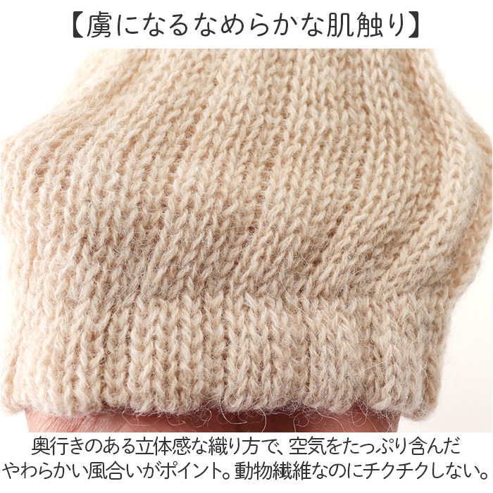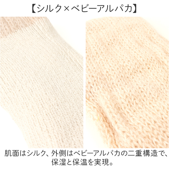 | 素材 | [外側]アルパカ90%、ポリエステル8%、ポリウレタン2% [内側]シルク75%、ナイロン25% |
