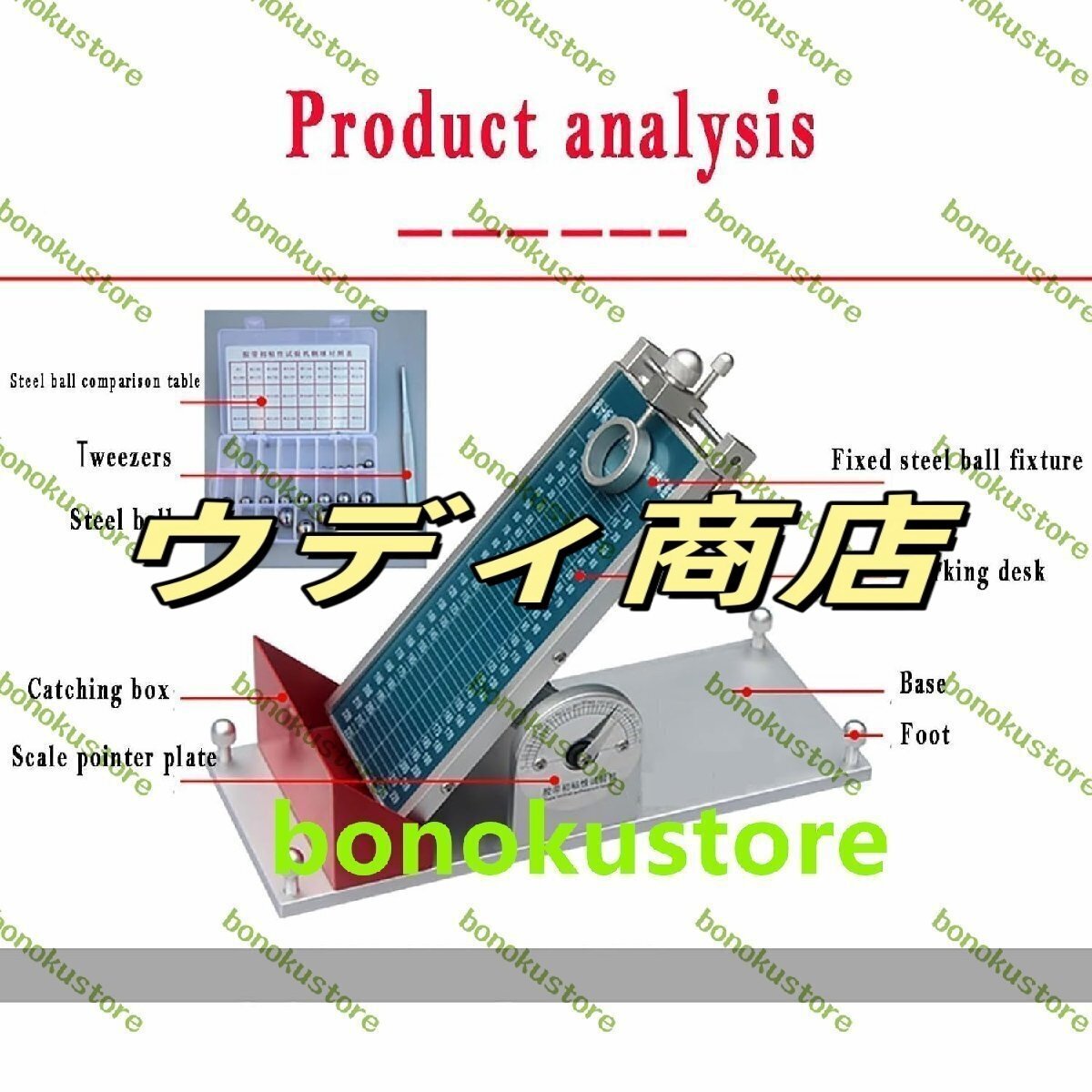 調整可能な傾斜角度: 0-60° 作業台幅:120mm テストエリア幅:80mm 標準鋼球:1/32インチ 1インチ傾斜プレート:厚さ3mm 平滑ガラスパネル 進入滑走路:長さ100mm 作業台幅:110mm 外形寸法:320(長さ)mm×140(幅)mm×180(高さ)mm 重量: 6kg