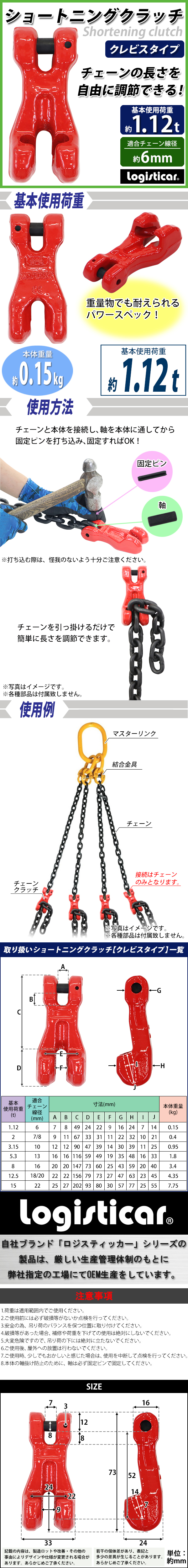 | 商品紹介 | ■◆ショートニングクラッチ クレビスタイプ◆■ ■使用用途に合わせて自由にカスタム出来るショートニングクラッチ クレビスタイプ! ■チェーンの長さを簡単に自由に調節できます! ■クレビス部分の接続はチェーンのみとなります。それ以外の物は接続しないでください。 ■掛け外しが簡単で玉掛け作業などに便利です。 ■焼き入れを行うことで強度を増しています。 ■簡単接続。 ■シリーズでサイズを豊富にご用意しております。 ※こちらの商品はチェーン専用です。 ■重量:約0.15kg ■基本使用荷重:約1.12t(1120kg) ■適合チェーン線径:約6mm ■材質:G80合金鋼(本体) ■製法:鍛造 ■塗装:粉体塗装 ★1階車上でのお渡しとなります。恐れ入りますが荷降ろし・搬入は、お客様にてお願い致します。 ●新品商品ではありますが、輸入商品の為、多少の擦り傷などがある場合がございますので、ご納得の上ご購入下さいませ。 ●ご購入後、お客様ご都合によるご返品、ご返金等は一切お受け致しておりません。 ●本商品を使用した際に発生したトラブル、事故につきまして、当社は一切の責任を負いません。ご使用に関しましては、全て自己責任にてお願い致します。 |