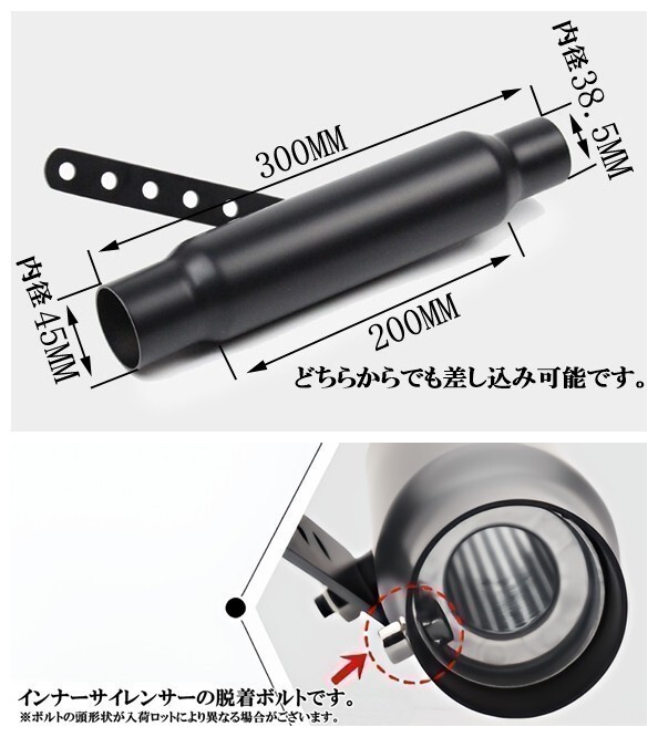 | 商品説明 | ご覧いただきありがとうございます。 【発送方法】 日本郵便ゆうパック(提携版) (1-2営業日以内に奈良県から出荷致します。) 【カラー】 艶消ブラック ×1本 ※別ページにて2本セットを出品しております。 【サイズ】 全長300mm 接続部の差込内径45mm径 接続部の差込内径38-39mm径 (どちらから差し込んでも使用可/接続部分に割りが入っていません) 【材質/内容】 スリップオンマフラー本体1本:鉄(スチール) ボルト、ナット、ステー:鉄(スチール) 製品重量:1190g (本体+付属品を一括計量時) 【備考】 脱着可能のグラスウール付きインナーサイレンサーが内蔵されております。(一度取り出すと差し込みに時間がかかります。) それ以上の消音をされる場合は別途消音加工が必要です。 【梱包】 また他の販売先よりも安く販売させていただいており、 再利用段ボールにて梱包となる場合がございます。 【適合判断および取付加工について】 差込径が45mm以下であれば、基本的には装着が可能ですが 実車を確認しないとわからないため、回答できません。 ご自身で適合するかが分からない場合は、 バイクショップなどの専門業者にご相談を推奨します。 汎用品のため、付属のステーのまま装着できないケースもあり また、差込口から排気漏れをしないように加工が必要なケースもあります。 ■商品についての詳細仕様書・説明書は付属しておりません。 ■輸入品のため使用に支障の無い小スレ・小キズなどある場合がございます。 ■入荷ロットにより仕様変更がある場合がございます。大きな変更があった場合は商品画像を変更致します。 ■車両名の記載が有る場合でも、汎用品ですので車種により取付可否と取付時の加工内容が異なります。 ■ご購入前に現車の形状確認をお願い致します。 ■社外の汎用部品につき、多少の加工を要する場合がございます。 ■作業などショップ様にご依頼する場合は |