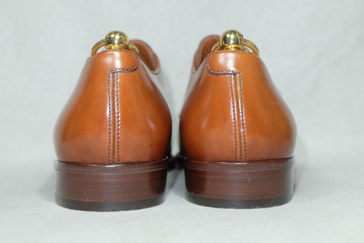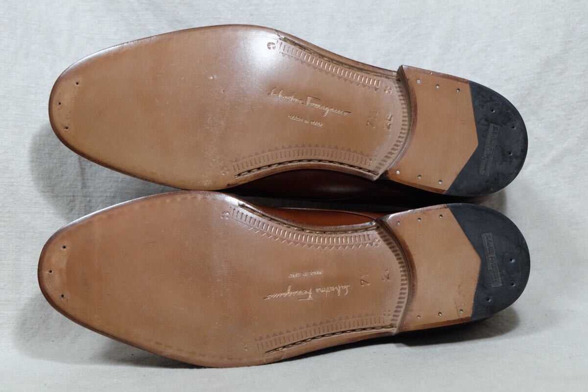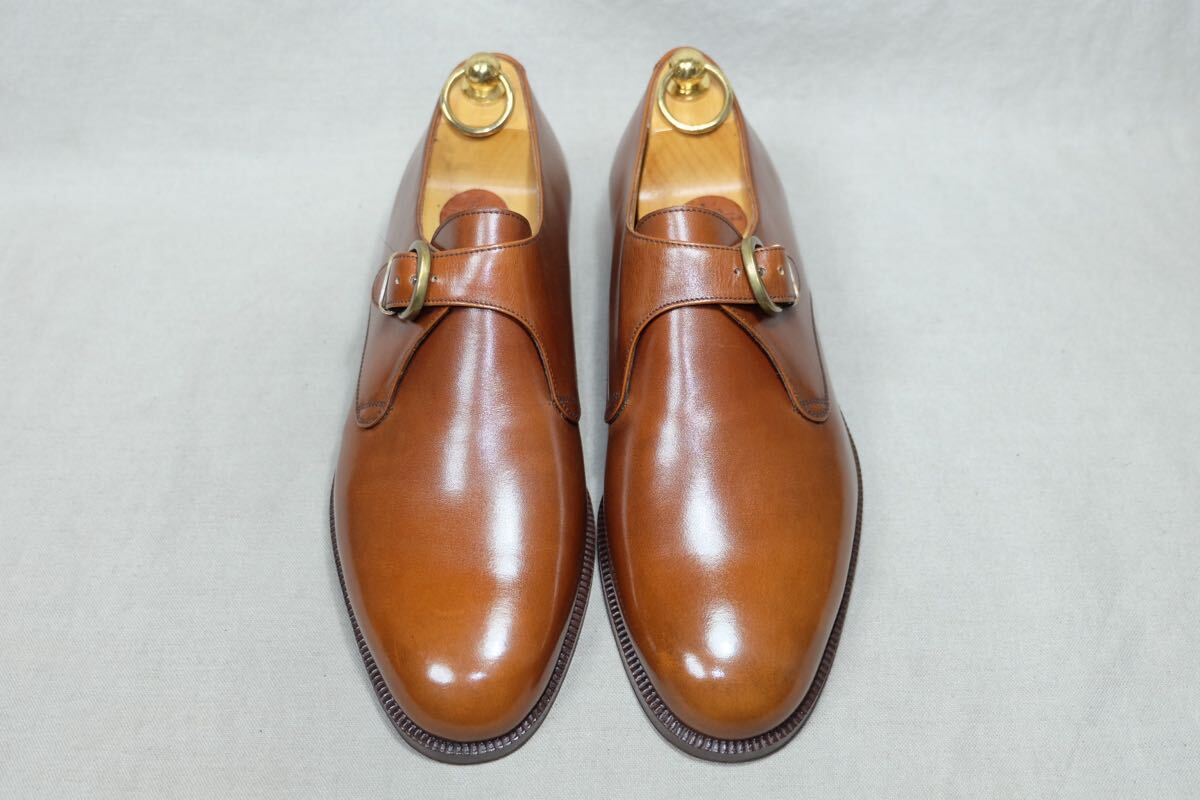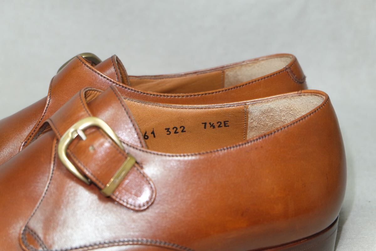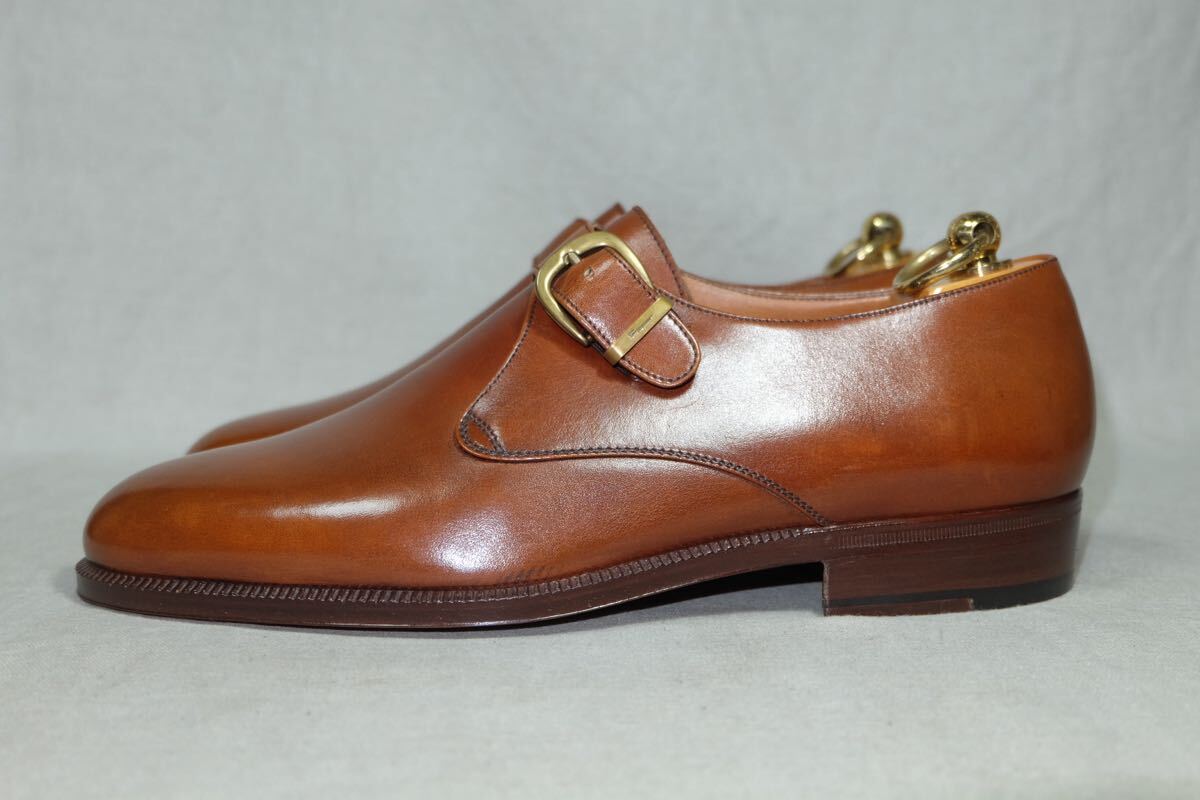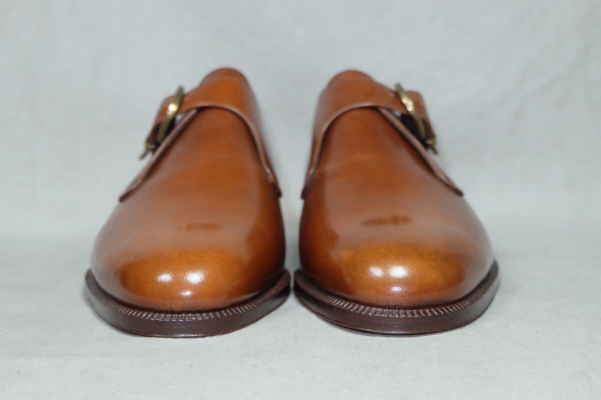 この度はアクセスありがとうございます。 ITALYの高級シューズブランドSalvatore Ferragamoヴィンテージシューズで現行のものより作り、デザイン、素材の全てが上質でエレガントなシングルモンクストラップシューズになります。アッパーは、しなやかで艶のある最高級カーフレザーを使用し、サルヴァトーレフェラガモの美しく洗練されたデザインに落とし込まれています。製法はクラシックなイタリアの手製のハンドメイドシューズで使用される伝統のマッケイ製法にすることで足馴染みがしやすい上に堅牢で屈曲性があり優雅で心地よい仕上がりとなっております。またこちらの製法はソール交換も複数回可能なので、永くお楽しみ頂ける一足になります。ソールの縫い目を隠す高度な技術であるヒドゥンチャネル仕上げ、美しく流麗なパターンなど履きやすさ、堅牢さ、美しさを合わせて持たせる技術力の高さ、人気、デザイン、クラス感とすべてが最高級の1足です。繊細なハンドメイド技術で贅沢に作り込まれた美しく極上の1足ですので永くお楽しみいただけるかと思います。 メンテナンス、クリーニングもさせて頂いた上で状態もかなり良好ですので、この機会にぜひご検討よろしくお願いします。ビスポークシューズ、ジョンロブ、ベルルッティ、J.M.WESTON、サンクリスピン、エルメス、サントーニ、コルテなどがお好きな方にもオススメの一足です。 サイズ:UK7.5EE( 約26cm) 型:シングルモンクストラップ アウトソール:28cm ソール最大幅:10.2cm ソール:レザーソール 素材:カーフレザー カラー:アンティークブラウン 生産国:ITALY 状態:10段階中【9.5】 アッパー:永く使用いただける美品です。 ソール:永く使用いただける美品です。 付属品:なし 基本的にはノークレームノーリターンなのでご不明点等あればお気軽にご質問、ご連絡ください。 注意事項 確認はしておりますが、中古品のため小さなキズ、汚れ等を見落とす場合があるので神経質な方はご入札をお控えください。 サイズはあくまで標準的なサイズ感なので、実寸やメーカーサイズをご参考頂きますようお願いいたします。 三日以内にご連絡いただけない場合、評価の末再出品させていただきますのでご了承ください。 | |||