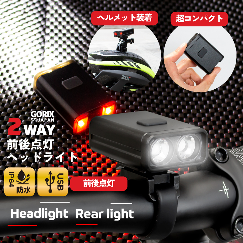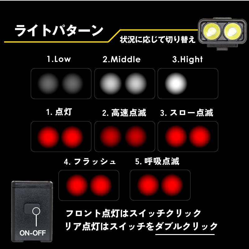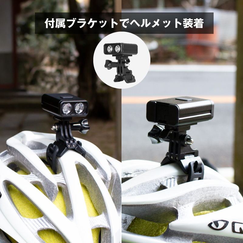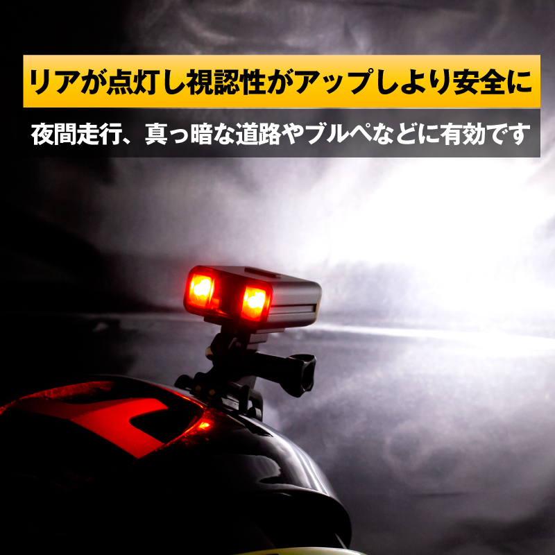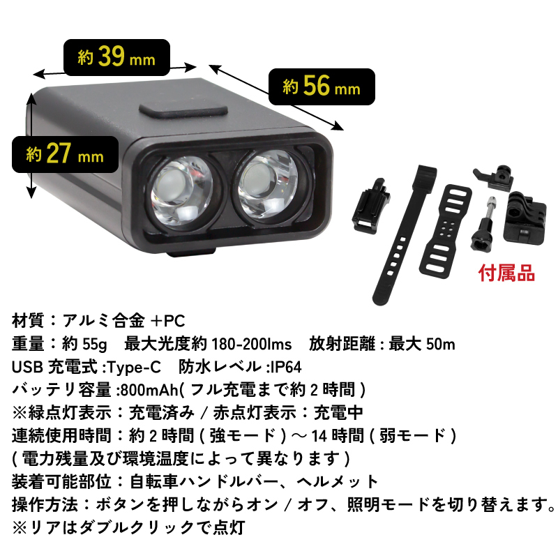 前も後ろも点灯! フロントライトとして、付属のブラケットを使えばヘルメットライトとしてそしてリアも光るライト。 様々な使い方ができる2wayサイクルライトです。 装着も簡単、工具不要でお使い頂けます。 USB充電は汎用性の高いタイプCを採用しています。 また高防水性があり雨や雪の中でも対応。 フロントライトとしてまた夜間のヘッドライトとして実用的なサイクルライト。 通勤や通学から夜の走行やトンネル内、ブルペなどに。 ロードバイクやクロスバイク、マウンテンバイク、ミニベロなど様々な車種の自転車に最適。 [前も後ろも点灯] フロントとリアが点灯するので状況に応じて利用できる。 また前後両方点灯させる事が可能。 [ヘルメットに装着] 付属のブラケットを使えばヘルメットに装着する事が可能です。 ヘルメットに装着してヘッドライトとして、そして後方に存在を示すリアライトとして使用できる。 より安全な夜間走行が期待されます。 (※ヘルメットの形状によって使えない場合もあります) [高防水] 天気に左右されずにタフに使える。 雨や雪の中でも気にせずに走行が可能。 [USB充電式] 手軽で便利なUSB充電。 パソコンやモバイルバッテリーなどから充電可能で人気。 また汎用性が高いタイプCを採用。 [明るくかわいいデザイン] コンパクトなデザインで邪魔にならずハンドルに装着してもスッキリと収まります。 小さいのに明るく頑丈で頼りがいのあるライトです。 [アルミ合金+PC] ライトシェルは工業用高強度アルミ合金とPC構造によって作られ、高い耐久性と信頼性があります。 [装着簡単] 工具要らずでブラケットの装着が可能。 またライトだけ取外しができるのでライトの盗難防止にも。 商品内容フロント&ヘルメットライト、ハンドルブラケット、ヘルメットブラケット 材質アルミ合金+PC サイズ長56x幅39x高さ約27mm 重量約55g 最大光度約180-200lms 放射距離最大50m USB充電式Type-C 防水レベルIP64 バッテリ容量800mAh(フル充電まで約2時間) ※緑点灯表示:充電済み/赤点灯表示:充電中 Light Beads2* 10W LED 連続使用時間約2時間(強モード)~14時間(弱モード)(電力残量及び環境温度によって異なります) 装着可能部位自転車ハンドルバー、ヘルメット 操作方法ボタンを押しながらオン/オフ、照明モードを切り替えます。 ※リアはダブルクリックで点灯 ※ヘルメットの形状によって使えない場合もあります ・商品は入荷によりキズがある場合があります。 その場合、保証対象外になりますのでご了承お願い致します。 ・ディスプレイ環境により実物と色が異なる場合が有ります。 ・入荷時期により予告無く一部仕様変更する場合が有ります。 | |
