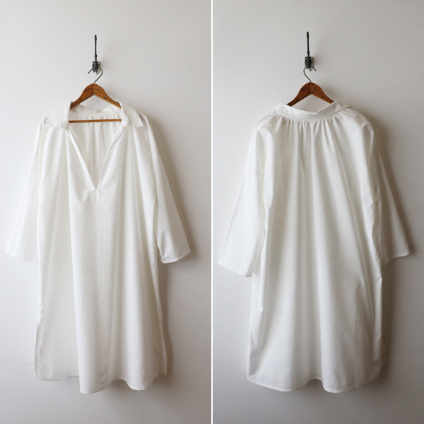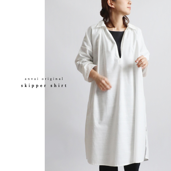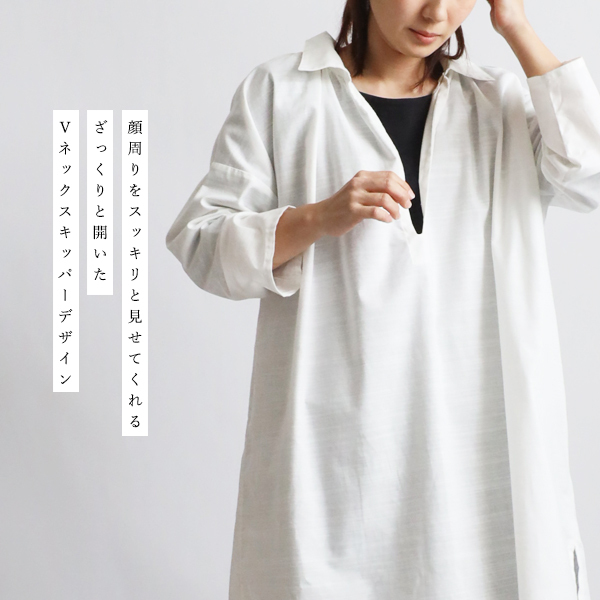 大きくカットされたVネック・スキッパー襟が素敵なシャツ ワンピース。