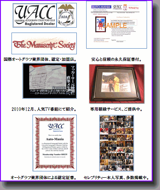 | ■当店の保証書について Auto-Mania.Comではお買上げいただいたオートグラフを 永久に保証いたします。以下は商品とともにお渡しする、当店の証明書兼保証書のサンプル画像です。