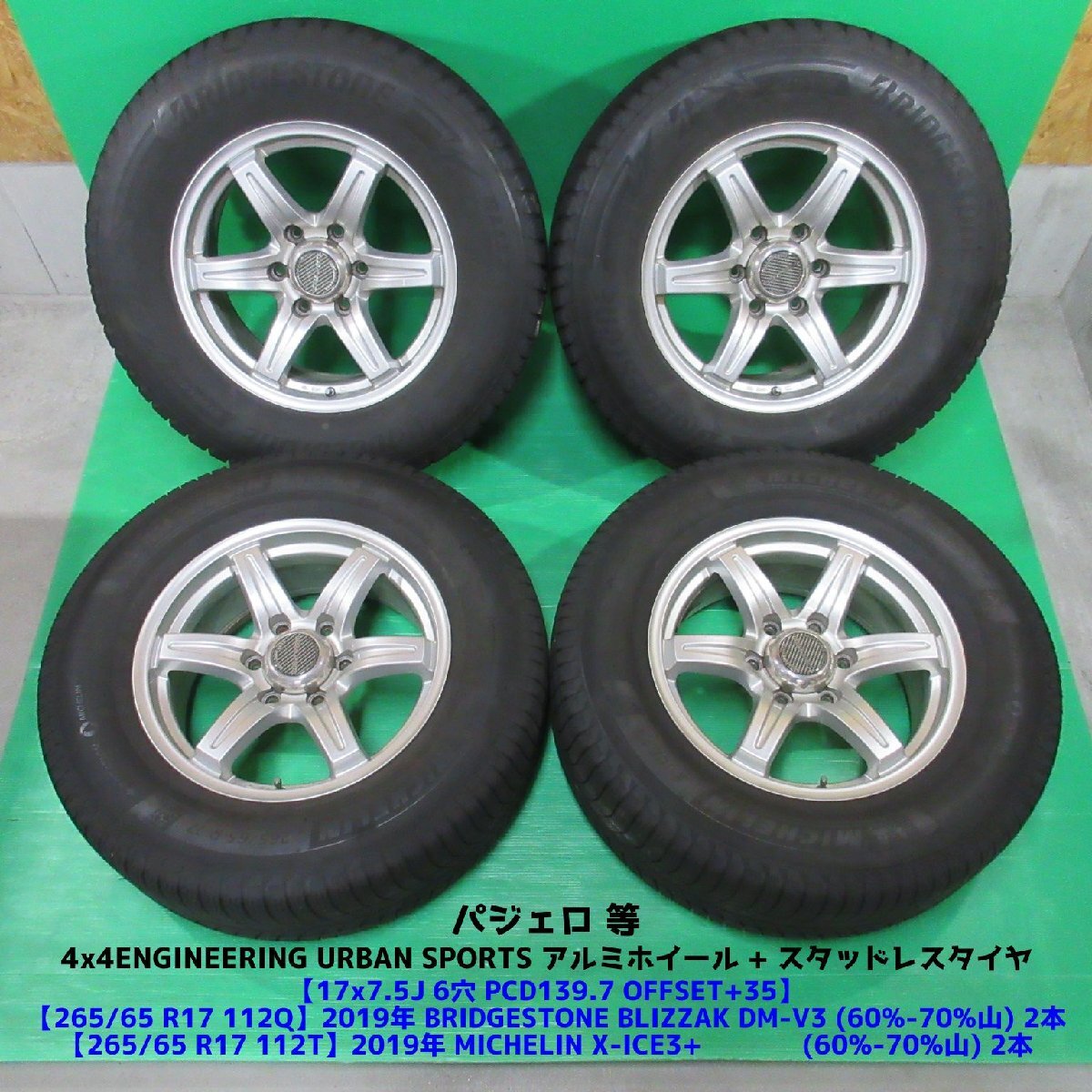 ・備考 【タイヤ】 残り溝:60%-70%山程度 ヒビ:中程度に有(接地面) パンク修理:1か所 【ホイール】 塗装のクモリ(くすみ):少し有(センターキャップ) 小傷や浅い傷等:少し有 汚れ付着:4x4ENGINEERING ホイールの一言評価『 中古品として一般的 』 ※その他 未洗浄商品です。 ※できるだけ詳細調査致しました。使用品・中古品となりますので、商品画像や商品説明を良くご覧いただいてご検討下さいませ。 ・発送について ![]() | ||||
