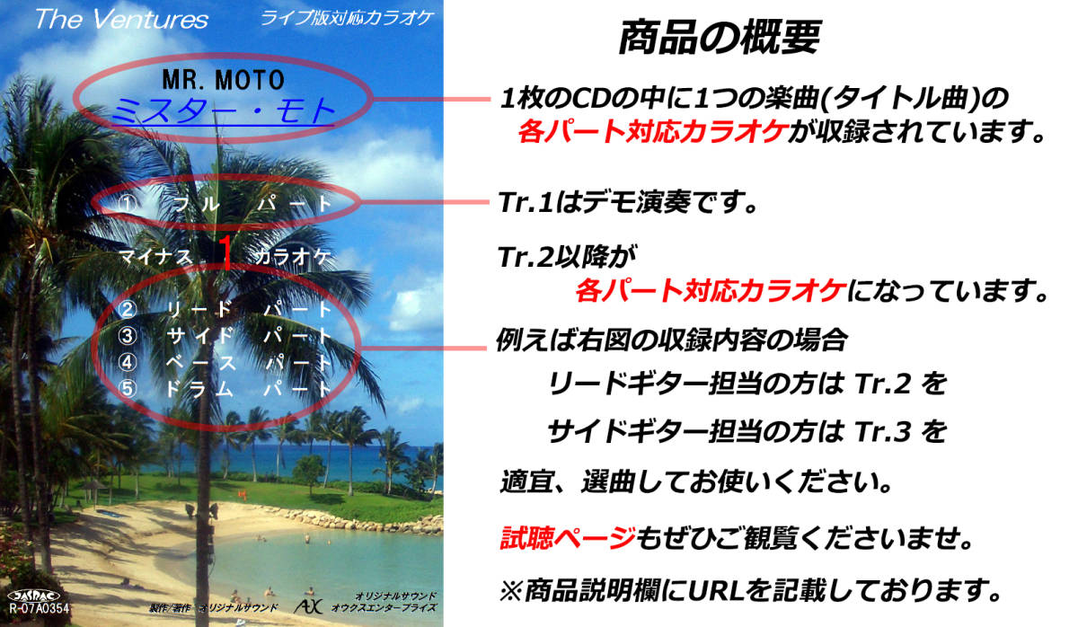 ~ザ・ベンチャーズを愛するすべての方へ~ リードギターはもちろん、これまで存在しなかった サイドギター・ベース・ドラム… 全パート対応カラオケが実現しました。 サイド奏者の方はサイドパートを ベース奏者の方はベースパートを ドラム奏者の方はドラムパートを CDプレーヤー(CD-R対応)に入れて選曲するだけで、 自分の演奏する楽器だけを簡単・自由にカットできます。 ライブビデオの音声に合わせて演奏する練習方法とは異なり、 より純粋に自身が奏でるメロディに集中できるため 高い練習効果が期待できます。 つまり、限りなく実際のステージに近い 音場を再現できるということです。 忙しくてセッションの時間をなかなか 取れない方いかがでしょうか? 『ステージ演奏やセッションの場に立つと、なぜか思った通りの演奏ができない』 とお悩みの方も、ぜひ一度お試しくださいませ。 |