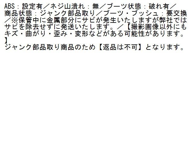 | 商品情報 | ABS:設定有/ネジ山潰れ:無/ブーツ状態:破れ有/商品状態:ジャンク部品取り/ブーツ・ブッシュ:要交換/※保管中に金属部分にサビが発生いたしますが弊社ではサビを除去せずに発送いたします。/【撮影画像以外にもキズ・曲がり・歪み・変形などがある可能性があります。】 | ||