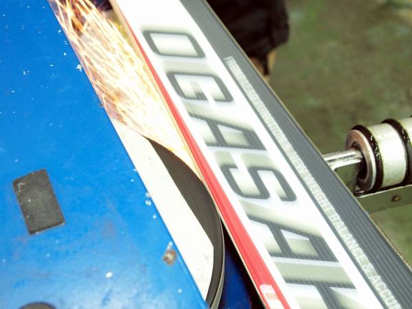 ●滑走面のノーズからテールまで均等に研磨し、ダメージのある古い滑走面を取り除きます。古くなった表面 を薄くスライスするイメージです。スライスの厚みはソールやベースエッジのダメージに応じて調整します。凹 凸のあるソールはこの工程で、まずフラットに近づけます。またこの 工程で比較的浅いすりキズ、線キズを取り除きます。熟練を要する重要な工程です。 |