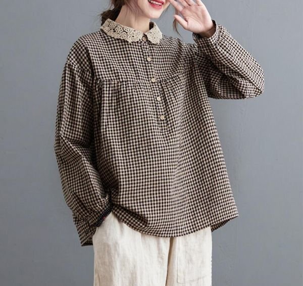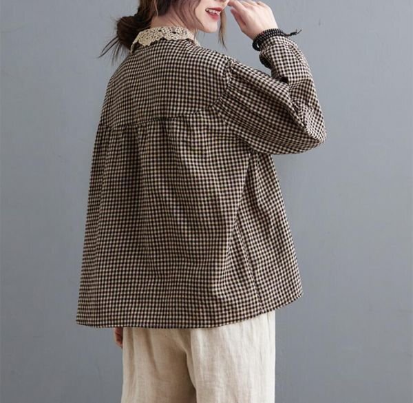 秋新品 カジュアル チェック柄 綿麻 超可愛い レース襟 ゆったり 大きいサイズ 長袖 シャツチュニック ★ 黒/Lサイズ [浏览原始页面]