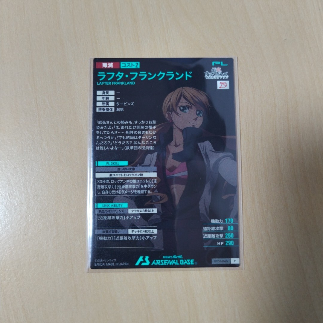 ガンダムアーセナルベース、Pレア、ラフタ・フランクランドの出品となります。未使用品です。排出後、スリーブに入れて保管していますが初期キズなど気になさる方はご遠慮ください。配送料金は梱包代込みで全国一律、120円とさせていただきます。他の出品との同梱は対応いたします。ノークレム、ノーリターンにてお願いいたします。