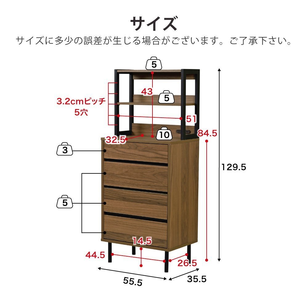 | 【カラー】 ブラウン×ブラック 【サイズ】 <外寸> 幅55.5×奥行35.5×高さ129.5cm <内寸> (オープンラック:幅51×奥行32.5×高さ43cm 可動棚:幅51×奥行18×厚み1.5cm(3.2cmピッチ5穴) 引き出し1段目:幅46×奥行28.5×高さ5.5(有効:7)cm 引き出し2~3段目:幅46×奥行28.5×高さ7.5(有効:9)cm 引き出し4段目:幅46×奥行28.5×高さ7.5(有効:11)cm 脚間:幅44.5×奥行26.5×高さ14.5cm 【材質】 本体:プリント紙化粧合板 脚:スチール(粉体塗装) 【耐荷重】 固定棚:(約)5kg以下 可動棚:(約)5kg以下 チェスト上:(約)10kg以下 引き出し1段目:(約)3kg以下 引き出し2~4段目:(約)5kg以下 【生産国】 中国 【梱包】 サイズ:75.9×40.4×24.3cm、重量:23.6kg 【その他】 ・背面化粧あり ・可動棚:1枚 ・アジャスター付き ・合計1500Wの2口コンセント付き(コード長さ180cm) 【組み立て品】 お客様による組み立てが必要です。 【ご注意】 ・サイズ、重量は概算です。 ・商品カラーはご使用のモニターによって実際の明るさや色と異なって見える場合がございます。 |