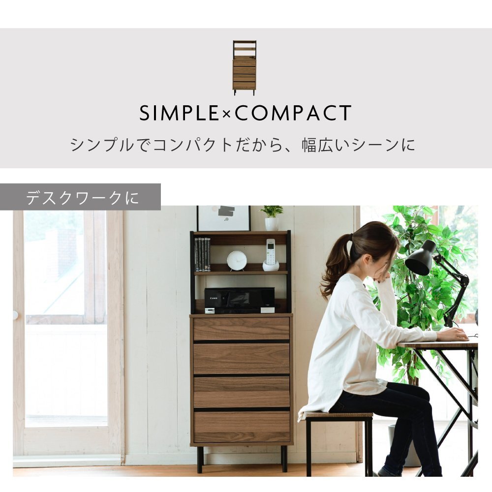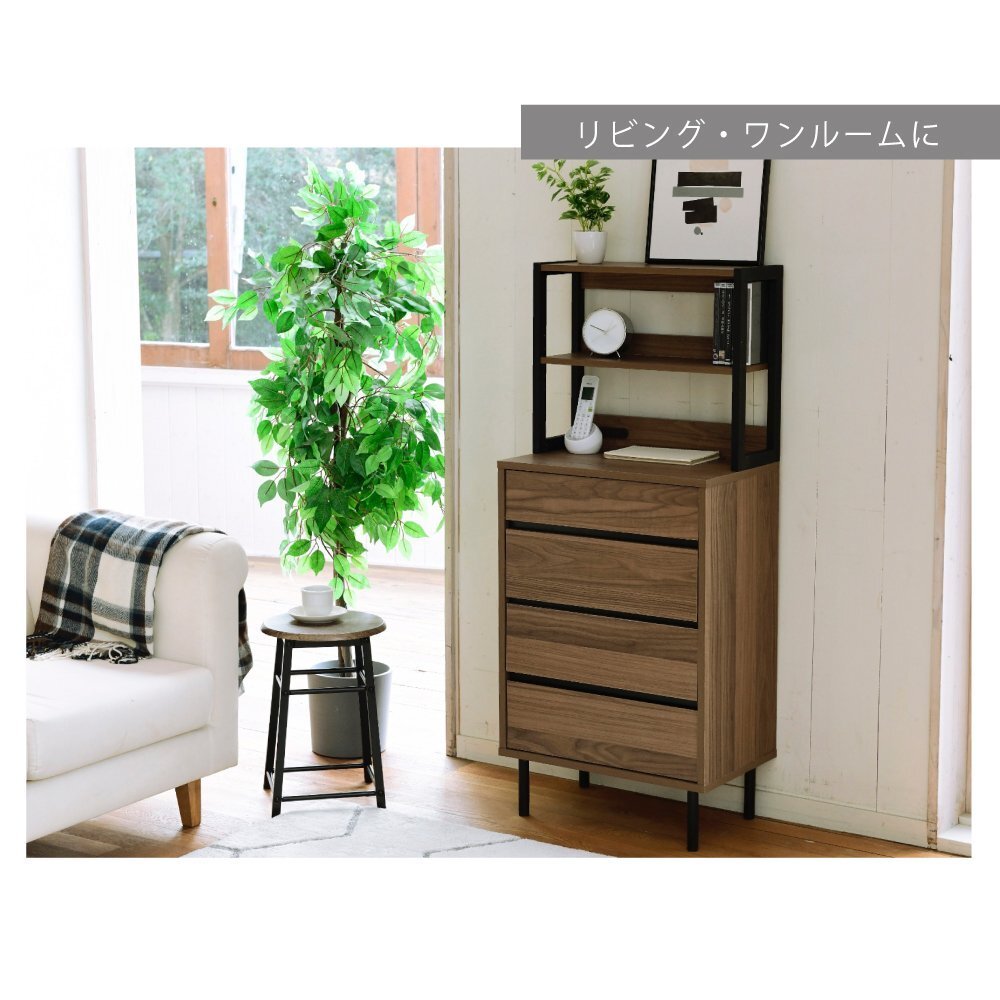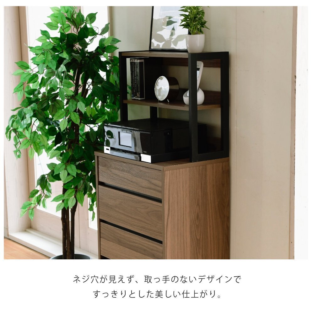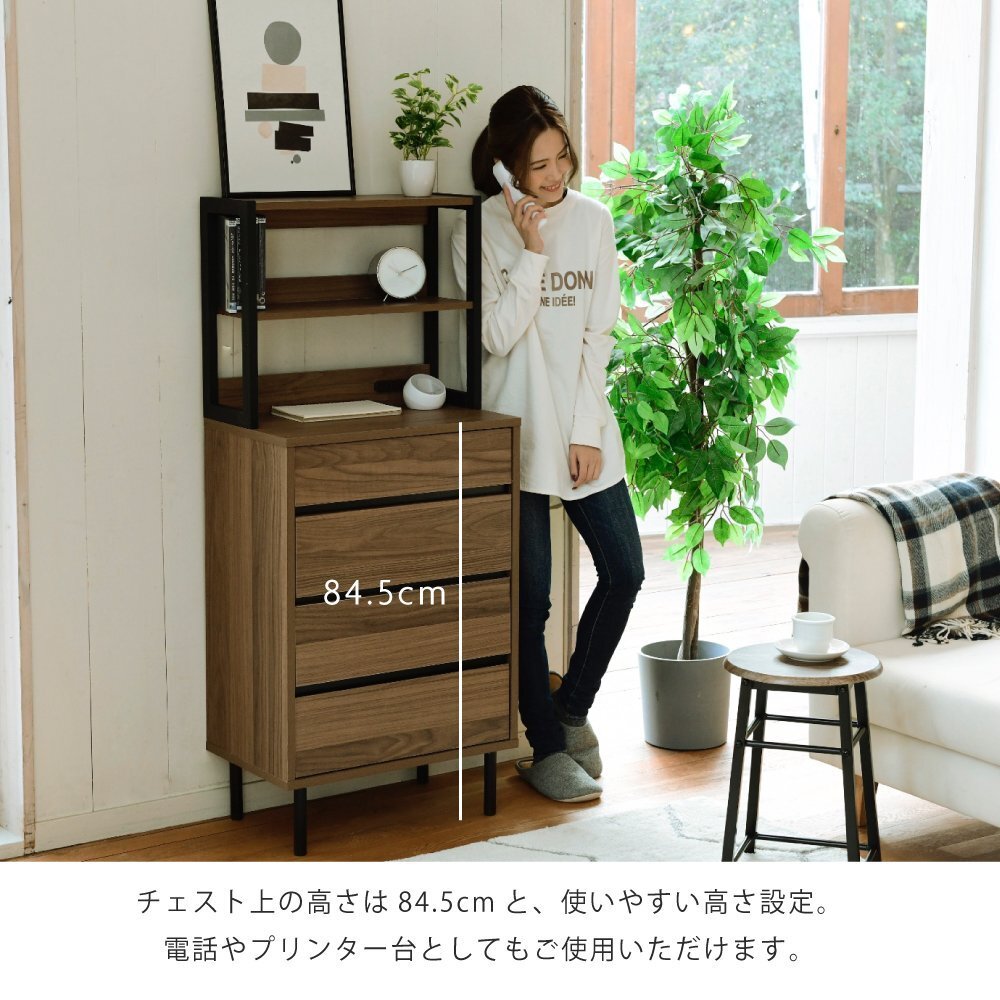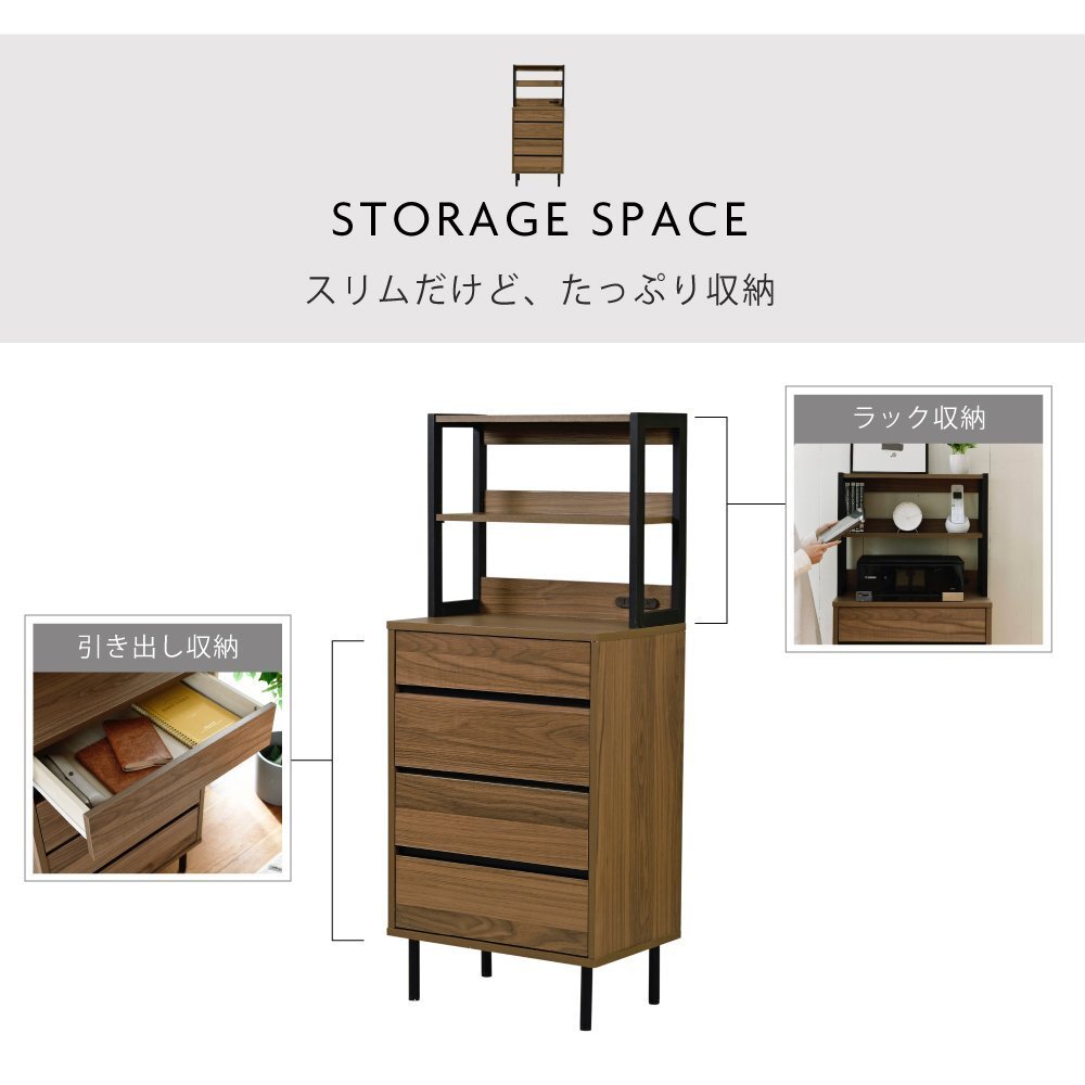 | 落ち着いた木目調のブラウンとブラックスチールの組み合わせがモダンな印象を与える、 北欧テイストシリーズ“Fresser”。 4段のチェストにオープンラックが付いたスリムチェストラック。 シンプルなデザインながら、飾るもので個性を演出できます。 |