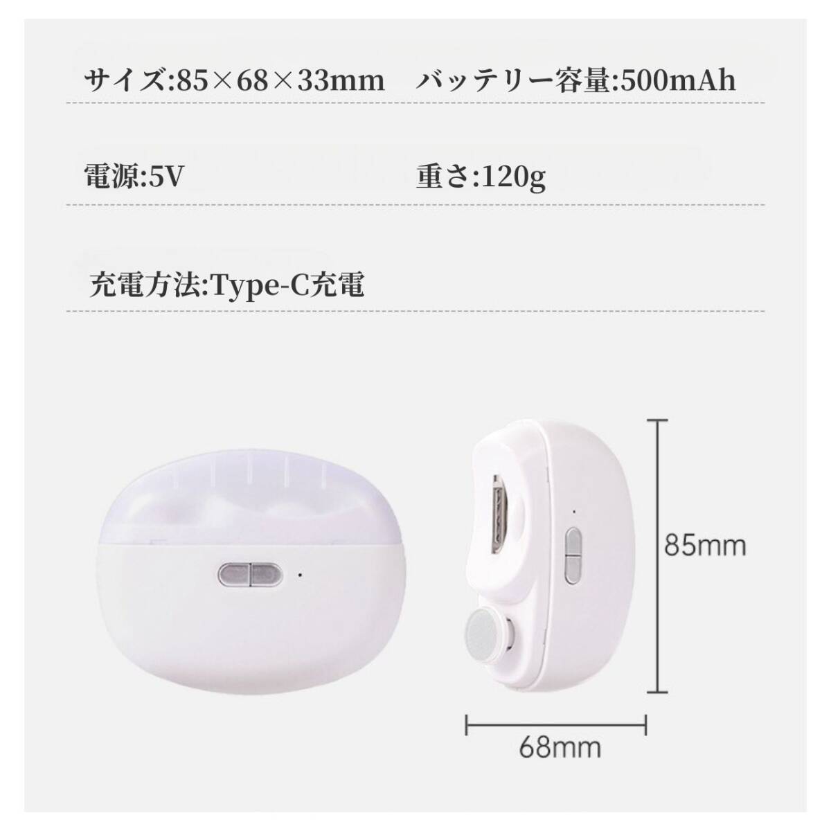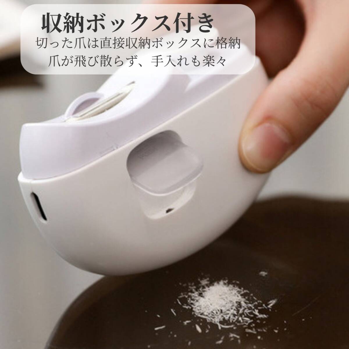 電動爪やすり【カラー】ピンクホワイト、パープルの販売もございます。【特長】- 爪切りと爪磨きが1台で可能!- 徐々に爪の半円を描くように動かし、切りすぎを防ぐ。- 360°回転式爪磨きで、爪の表面もピカピカ!清潔感アップ!【2段階回転速度】- 2段階のスピード調節可能。- 爪削りダストが本体のダストボックスに溜まるので、捨てる際に便利。【安全性とデュアルスピード調整】- 2つの速度設定で効率的かつ安全にトリミング可能。- 子供の柔らかい爪から硬い爪まで対応。- 安全ロック設計でお子様も安心して使用可能。【使用感