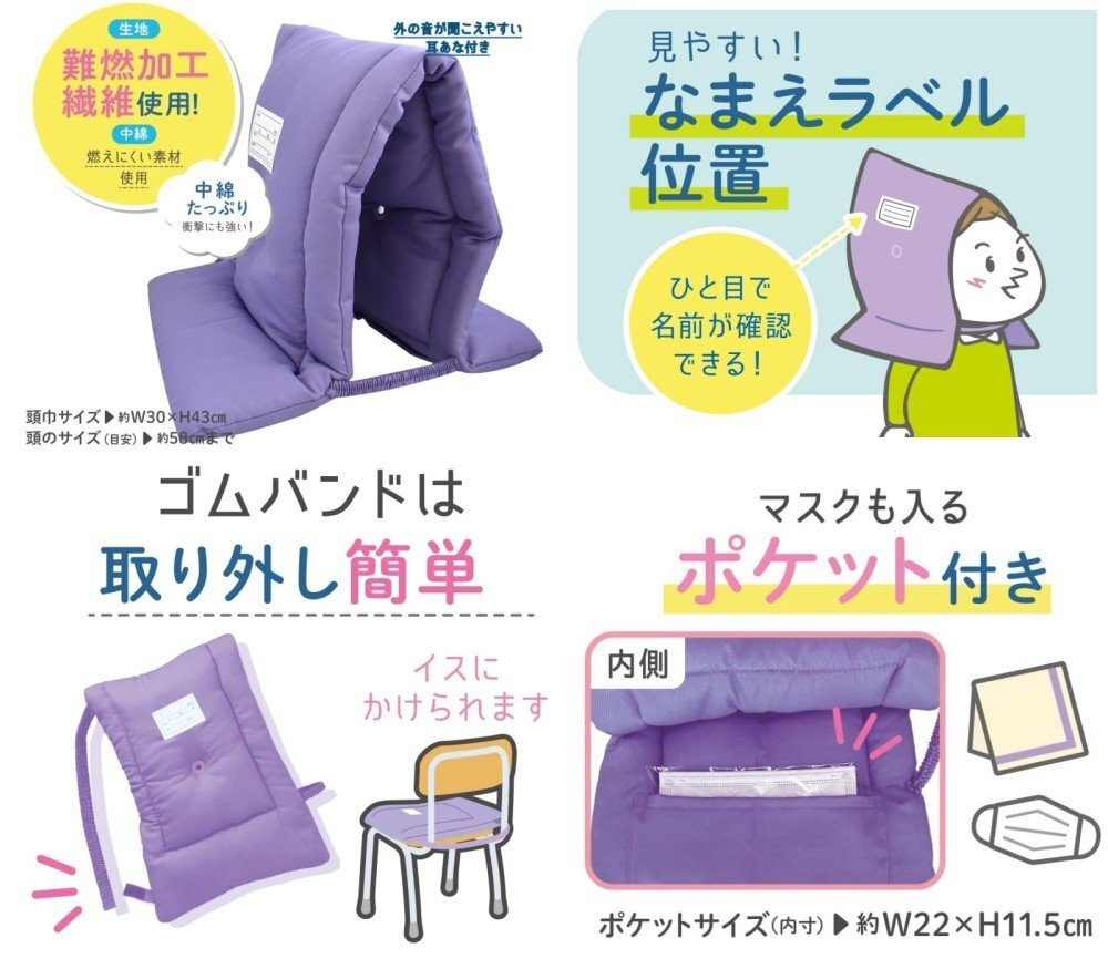 中綿たっぷりで衝撃にも強く、生地は難燃加工素材を使用した防災ずきん。内側にはマスクも入るポケット付き 外の音が聞きやすい耳穴付き。ゴムバンドは取り外し可。頭のサイズは約58cmまで ※汚れた場合は、薄めの中性洗剤で軽く拭き取るか、汚れた部分を優しく手洗いしてください。 ※洗濯機、乾燥機、アイロンを使用すると型崩れによる耐衝撃性能や難燃効果の低下の原因になるため使用しないでください。 |