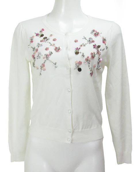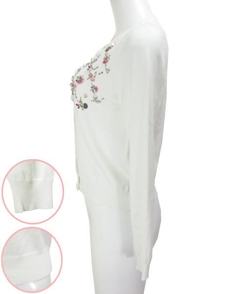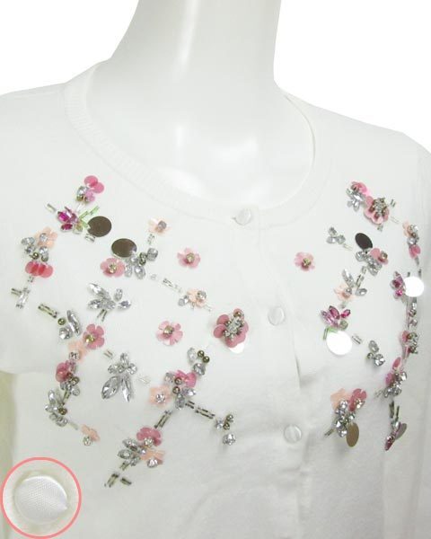 | コメント | 胸元にビジューがたっぷりの華やかなカーディガン。 白なので、インナーやボトムスのお色を選ばずお使い頂けます。 空調の効いた場所や朝晩のお出かけなどにあると便利な アイテム。 |