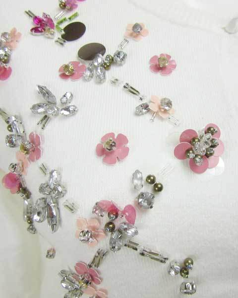 | 胸元にビジューがたっぷりの華やかなカーディガン。白なので、インナーやボトムスのお色を選ばずお使い頂けます。空調の効いた場所や朝晩のお出かけなどにあると便利なアイテム。 |